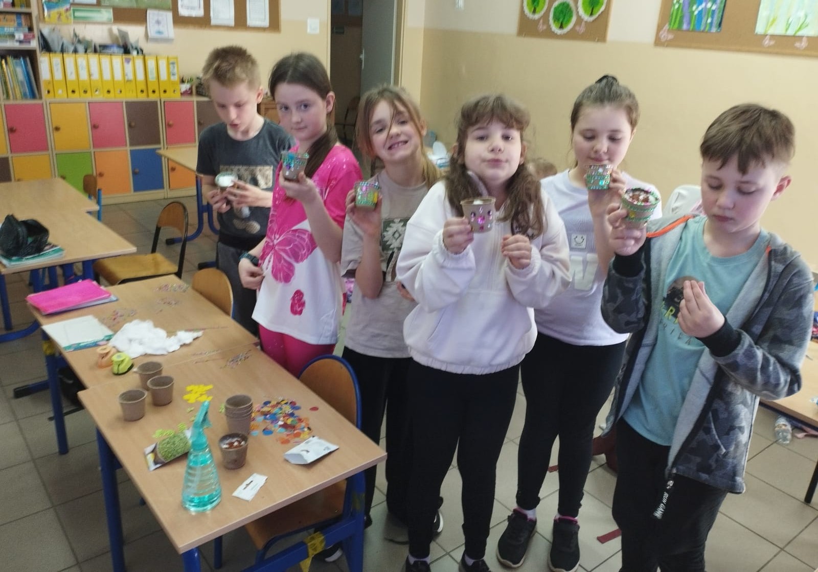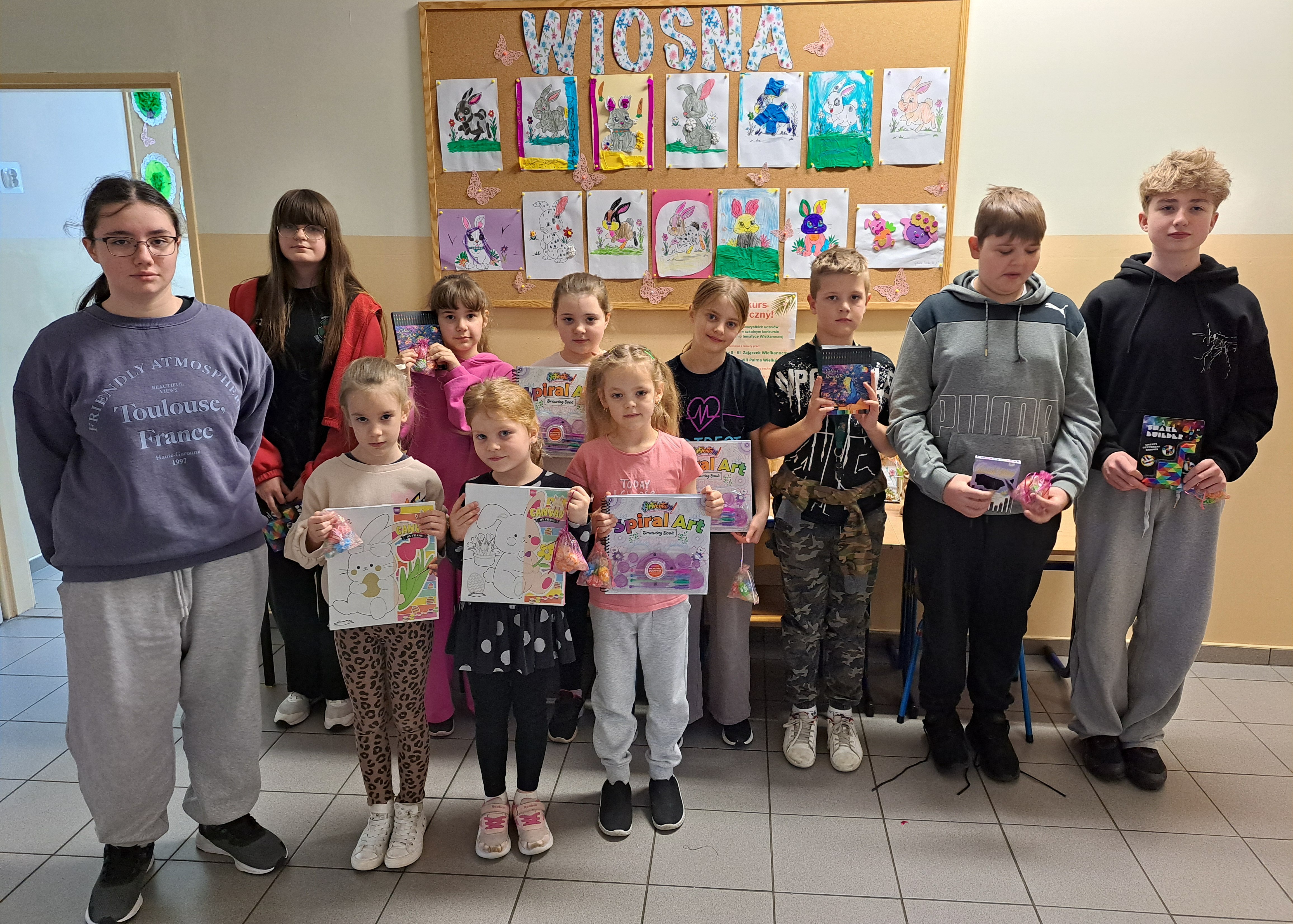 Podczas Wielkiego Tygodnia w klasach 1-3 dzieci pracowały nadzwyczaj intensywnie. Oprócz zajęć dydaktycznych najmłodsi hodowali rzeżuchę , wyszywali zajączki wielkanocne, kolorowali pisanki oraz wykonywali specjalne zadania w grupach dla zajączka. Jak przysłowie mówi: "ciężka praca się opłaca" tak było i tym razem. Nasz bohater wszystkich obdarował prezentami. Uczniowie wzięli także udział w konkursie na palmę wielkanocną i ozdobę świąteczną. Wszystkie prace były piękne i wyjątkowe, komisja miała ciężkie zadanie, aby wybrać tą najpiękniejszą. Wszyscy uczestnicy konkursu zostali nagrodzeni za swoją kreatwyność.