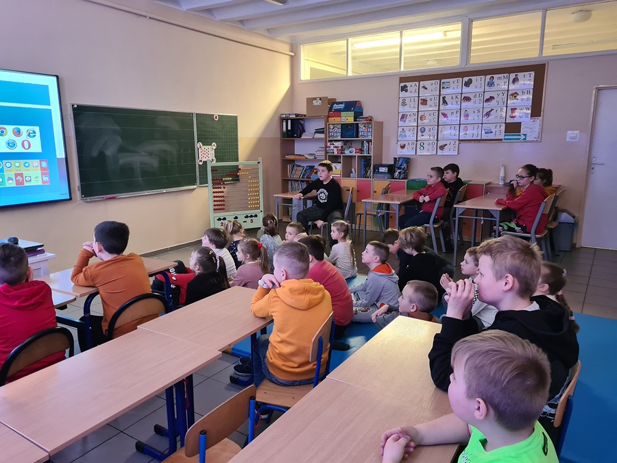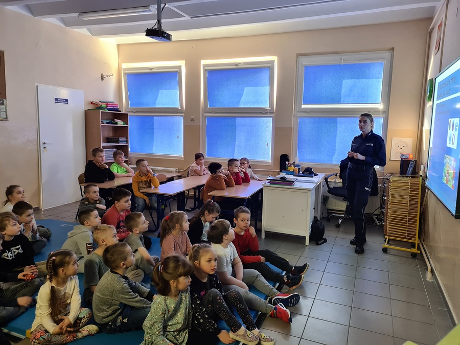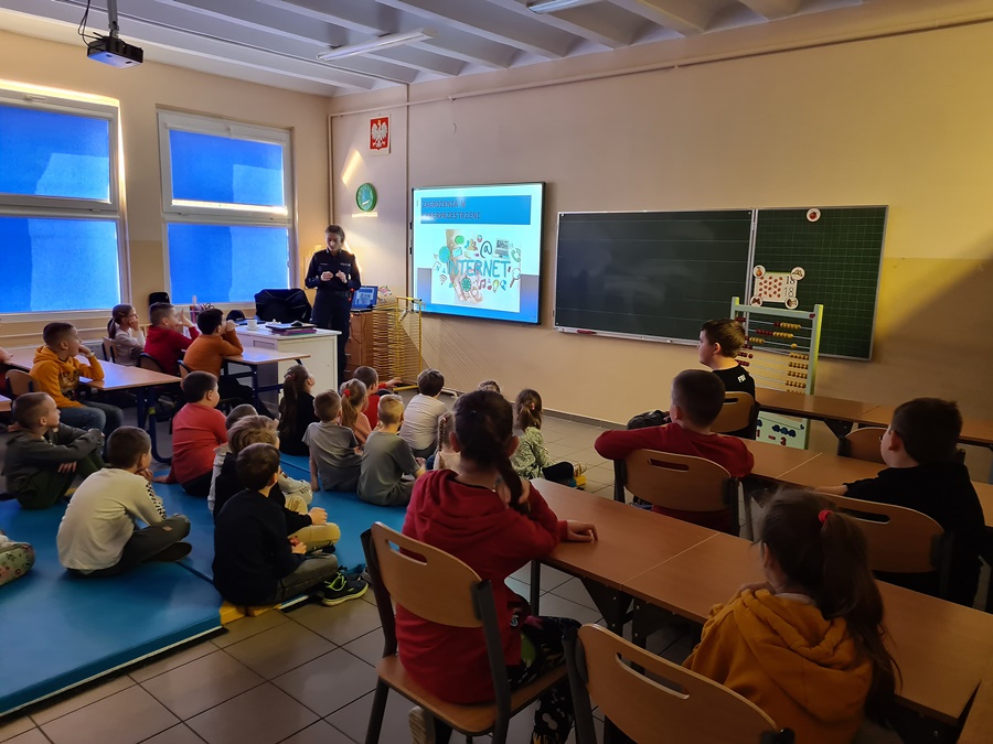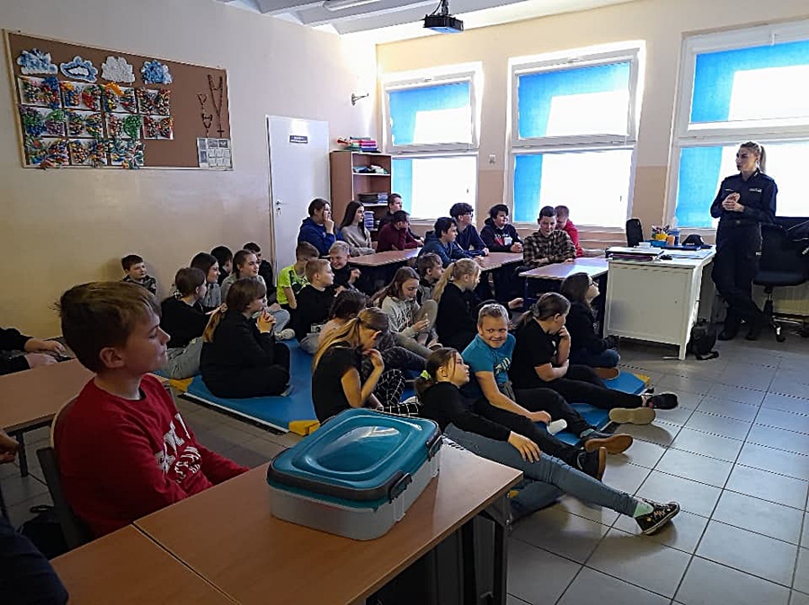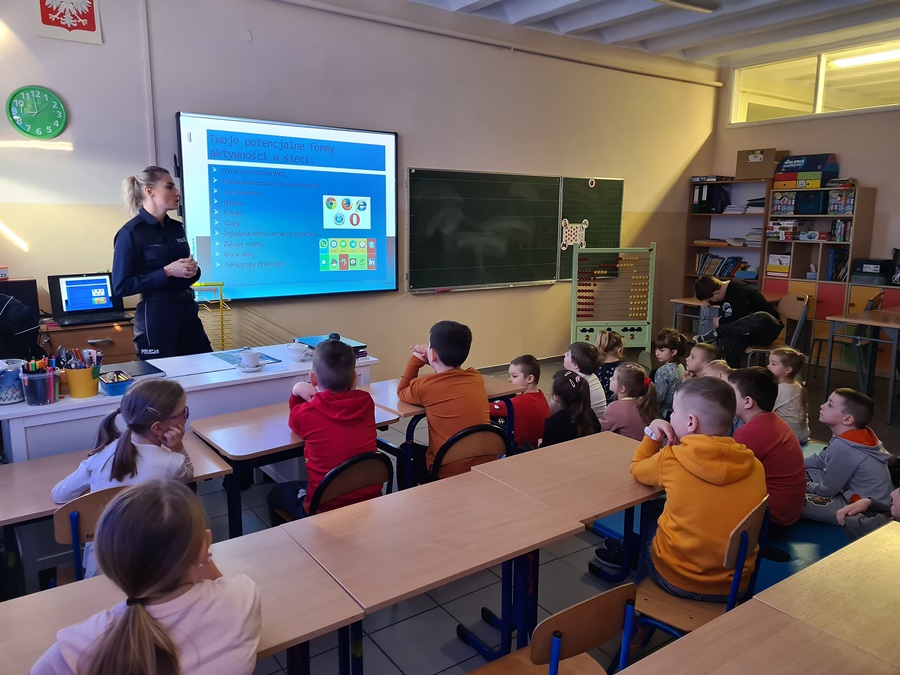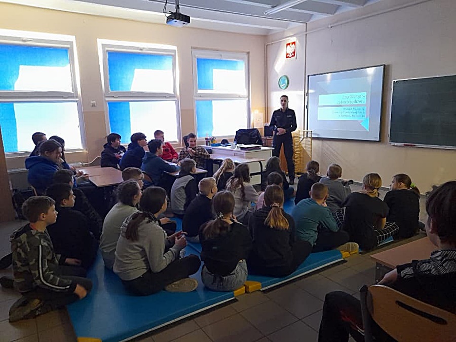 Policjantka omówiła zagrożenia związane z cyberprzestrzenią, o formach przemocy, miejscach występowania cyberprzemocy, komu należy zgłaszać, jak należy zabezpieczyć dowody. Przestrzegała nad nadmierną ufnością w stosunku do osób poznanych w wirtualnym świecie, o treściach negatywnie wpływających na psychikę młodego człowieka. W starszych klasach policjantka omówiła temat związany z uzależnieniem od e - papierosów, kłopotach zdrowotnych, nałogu, który niesie poważne konsekwencje.
