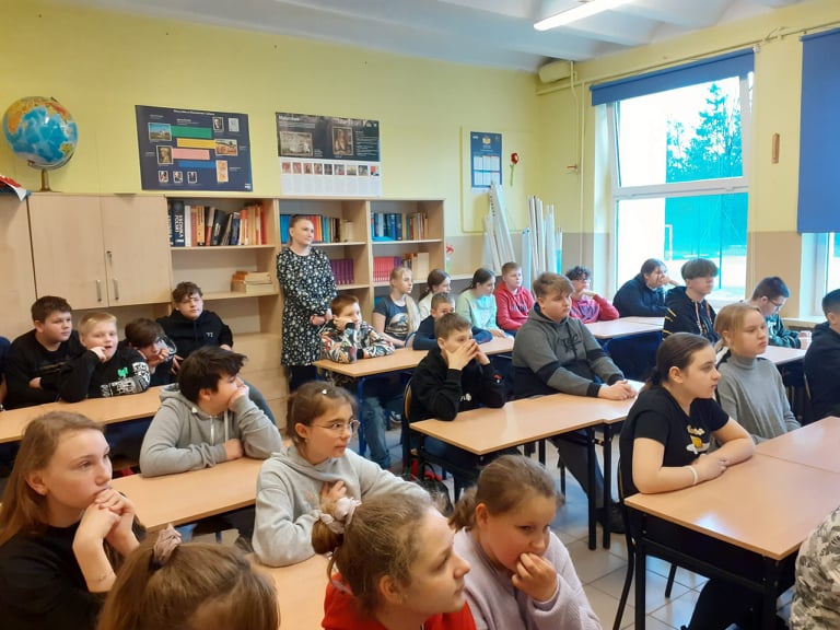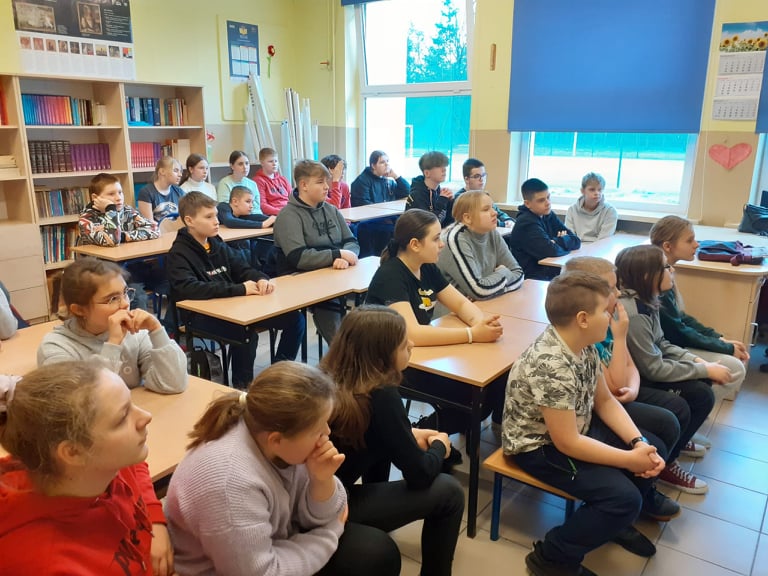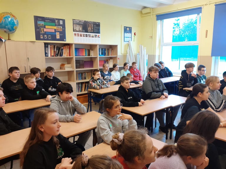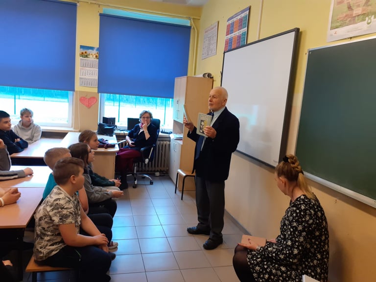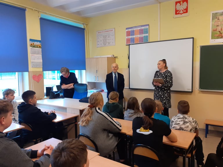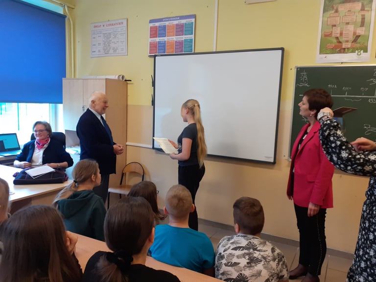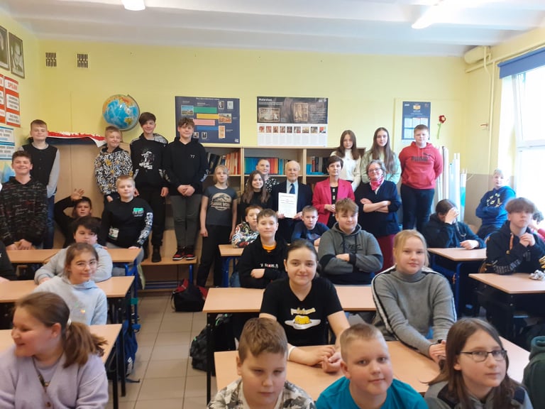 W latach pracy zawodowej opublikował także ponad 200 innych prac – projektów, artykułów skryptów, ekspertyz - w kraju i za granicą. Tadeusz Jastrzębski urodził się w 1937 roku w Poznaniu, wczesne dzieciństwo przeżył w czasie wojny w Warszawie i Tomaszowie Mazowieckim. Później mieszkał w Lesznie Wielkopolskim, Czarnkowie, Ostrowie Wielkopolskim i Gdańsku, a obecnie w Szczecinie. W wymienionej wcześniej książce ,,Żeglując przez życie” zawarł swoje wspomnienia, opisując czasy przedwojenne, lata okupacji, Powstanie Warszawskie, naukę w szkole podstawowej i liceum, aż po ukończenie w 1960 r. studiów na Wydziale Budowy Okrętów Politechniki Gdańskiej. W latach 1960 – 1979 był projektantem konstrukcji okrętów w Stoczni im. Komuny Paryskiej w Gdyni i Stoczni w Oranie – Algieria. Wiele jego zrealizowanych projektów konstrukcji statków to m. in. masowce, zbiornikowce, statki rybackie. Od roku 1979 pracował naukowo i był dydaktykiem w Politechnice Szczecińskiej oraz Wyższej Szkoły Morskiej w Szczecinie. Do chwili przejścia na emeryturę był profesorem nadzwyczajnym Politechniki Szczecińskiej oraz kierownikiem Katedry Konstrukcji i Mechaniki Okrętów na Wydziale Techniki Morskiej. Do roku 2014 kierował także Zespołem Realizacji Projektów Europejskich na Wydziale Techniki Morskiej i Transportu w Zachodniopomorskim Uniwersytecie Technologicznym w Szczecinie. W swoim środowisku był znany jako inicjator i kierujący kilkoma projektami finansowymi z funduszy Unii Europejskiej – INMOR, INBAT, MARSTRUCT, EUROVIP. Pan Tadeusz Jastrzębski był też wykładowcą i konsultantem w okrętowych biurach projektowych, był członkiem komitetów technicznych międzynarodowych towarzystw klasyfikacyjnych i Polskiego Rejestru Statków. Przez wiele lat był także członkiem międzynarodowej organizacji naukowej International Ship and Offshore Structres Congress (ISSC) oraz francuskiego towarzystwa naukowo – technicznego Association Technique Maritime et Aeronautique (ATMA). Uczniowie z zaciekawieniem słuchali opowieści autora, zadawali dużo pytań, związanych z jego życiem, nauką i pisarstwem. Na koniec podziękowaliśmy za spotkanie spędzone w miłej atmosferze i uwieczniliśmy zdjęciem pamiątkowym.