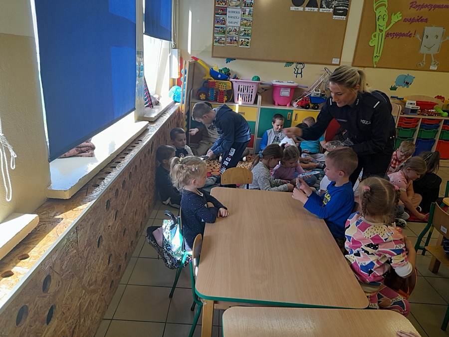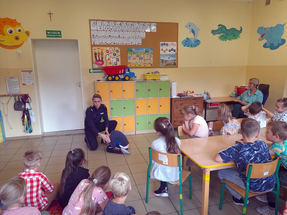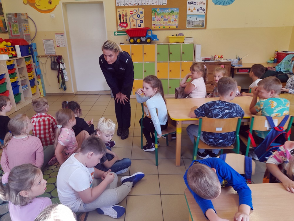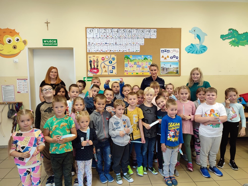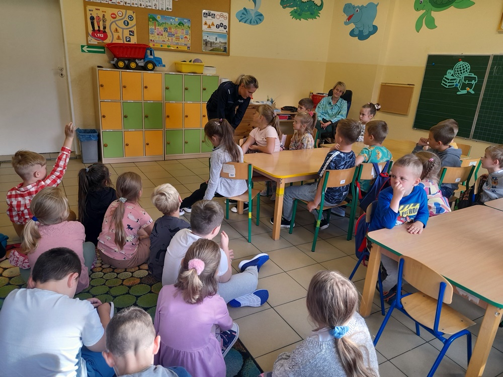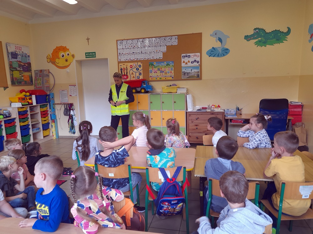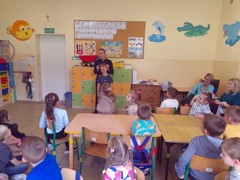 Przestrzegała najmłodszych przed groźnymi zwierzętami oraz jak należy uniknąć niebezpiecznej sytuacji. Natomiast rodzice powinni pamiętać o obowiązku przewożenia swoich pociech w fotelikach ochronnych lub specjalnych siedziskach. Powtórzone zostały numery alarmowe oraz konieczność noszenia ubrań i obuwia posiadającego elementy odblaskowe. Duże zainteresowanie wzbudził mundur funkcjonariuszki oraz akcesoria potrzebne do pracy. Niektórzy uczniowie zadawali pytania oraz dzielili się swoimi doświadczeniami. Uczniowie na zakończenie spotkania otrzymali zakładki. Wspólne zdjęcie uwieczniło niecodzienną wizytę.