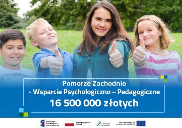 Grant w ramach realizacji projektu pn. "POMORZE ZACHODNIE - WSPARCIE PSYCHOLOGICZNO - PEDAGOGICZNE" współfinansowanego przez Unię Europejską w ramach Europejskiego Funduszu Społecznego, Działanie 7.7 Wdrożenie programów wczesnego wykrywania wad rozwojowych i rehabilitacji dzieci z niepełnosprawnościami oraz zagrożonych niepełnosprawnością oraz przedsięwzięć związanych z walką i zapobieganiem COVID-19 Regionalnego Programu Operacyjnego Województwa Zachodniopomorskiego 2014-2020.