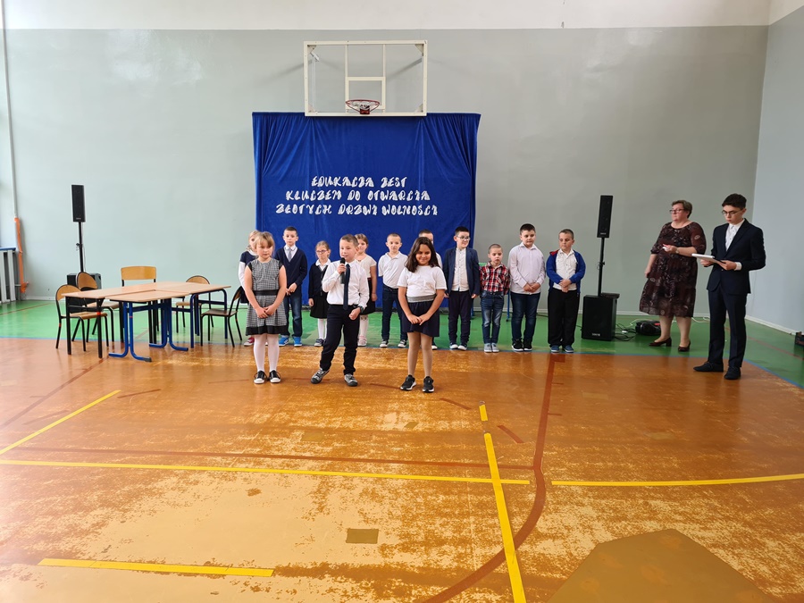 Uczniowie prezentując swoje umiejętności recytatorskie, aktorskie i wokalne podziękowali nauczycielom i pracownikom szkoły za czas i uśmiech, przyjazną dłoń, przekazywaną wiedzę i mądrość, za zachęcanie do twórczego myślenia i za dodawanie odwagi.