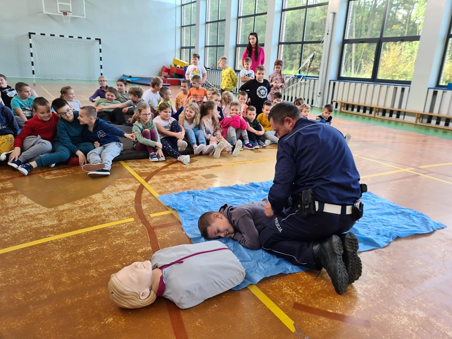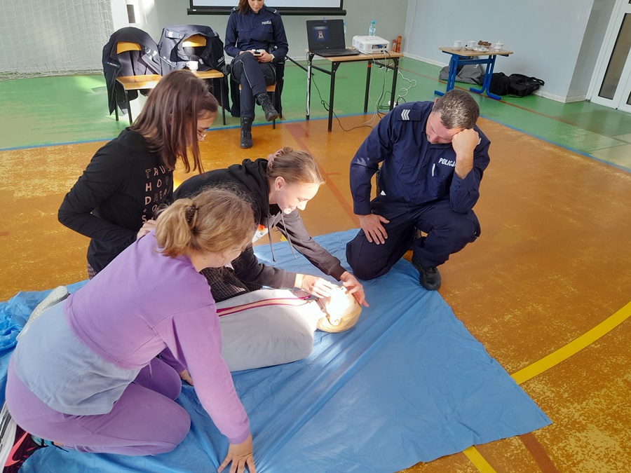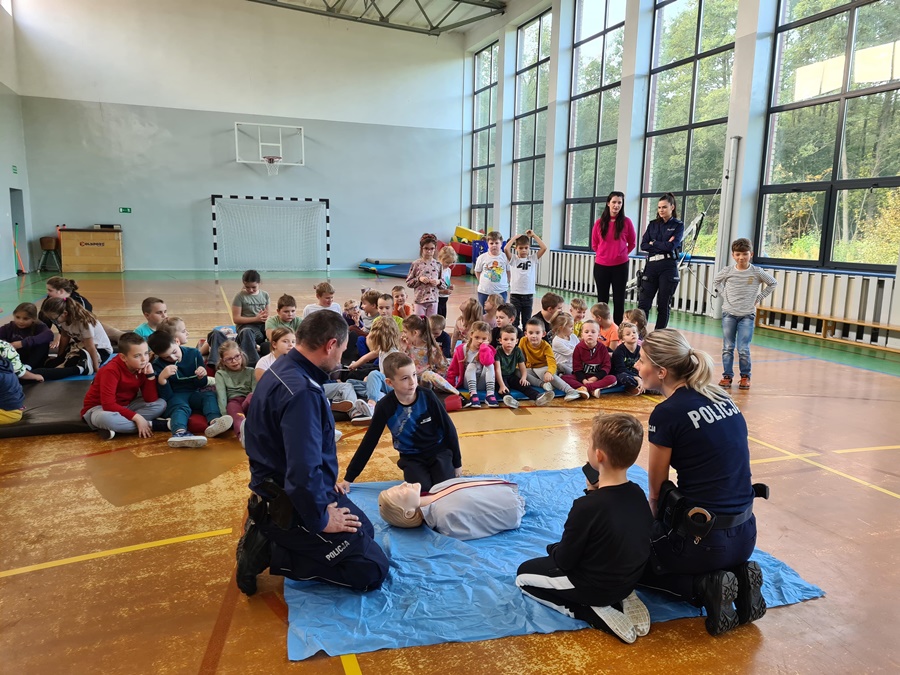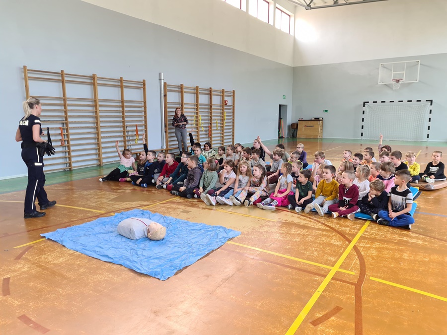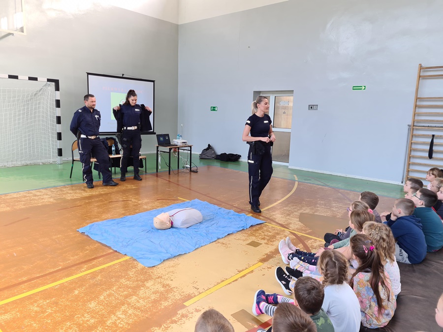 Celem wizyty było przypomnienie zasad udzielania pierwszej pomocy, ważnych telefonów, jak zachować się podczas wypadku, jak określić położenie na drodze, którą jedziemy, ułożenie osoby poszkodowanej w pozycji bezpiecznej. W pierwszej kolejności funkcjonariuszka zaprezentowała prezentację w sposób teoretyczny, następnie były zajęcia praktyczne. Uczniowie dowiedzieli się, że ważnym elementem podczas udzielania pomocy jest ocena miejsca zdarzenia pod kątem bezpieczeństwa i jeśli jest bezpiecznie można przystąpić do udzielania pomocy, dbając o własne bezpieczeństwo. Następnie ważna jest ocena przytomności, należy podejść do poszkodowanego, upewnić się - czy jest przytomny. Jeśli zareaguje - poszkodowany jest przytomny, brak reakcji oznacza, że poszkodowany jest nieprzytomny. Jeśli są świadkowie zdarzenia, osoby postronne, wyznaczamy osobę do pomocy. Prosimy o wezwanie pogotowia, upewniamy się czy pogotowie zostało wezwane. Jeśli jesteśmy sami, a poszkodowany jest osobą dorosłą przed rozpoczęciem resuscytacji krążeniowo - oddechowej musimy wezwać odpowiednie służby. W Polsce używamy numeru alarmowego 112 lub bezpośredniego 999. Wzywający musi poinformować o miejscu zdarzenia, liczbie poszkodowanych, ich stanie, co się stało i podać swój numer telefonu. Należy zachowywać się asertywnie i zdecydowanie, wydawać krótkie i zrozumiałe polecenia. Przed oceną oddechu należy udrożnić drogi oddechowe przez odgięcie głowy poszkodowanego do tyłu. Następnie stosujemy metodę ,,3P”: poczuj (zbliżamy ucho do ust i nosa poszkodowanego), posłuchaj, popatrz (ruch klatki piersiowej i brzucha). Ocenę prowadzimy przez 10 sekund. Jeśli usłyszeliśmy, zobaczyliśmy, poczuliśmy dwa lub więcej oddechów przyjmujemy, że poszkodowany oddycha. Jeśli oddechów było mniej przyjmujemy, że poszkodowany nie oddycha. Lekcja z pierwszej pomocy zostanie długo w pamięci naszych uczniów. Dziękujemy policjantom za spotkanie, przekazanie ważnych oraz cennych informacji i poświęcenie swojego czasu.