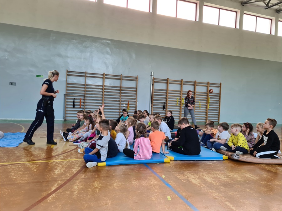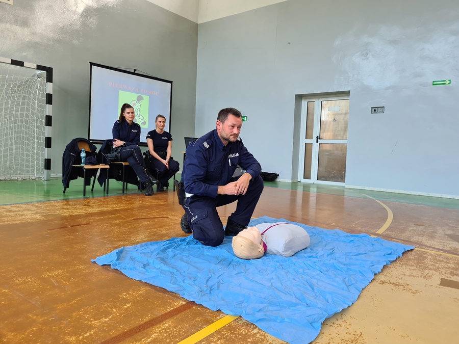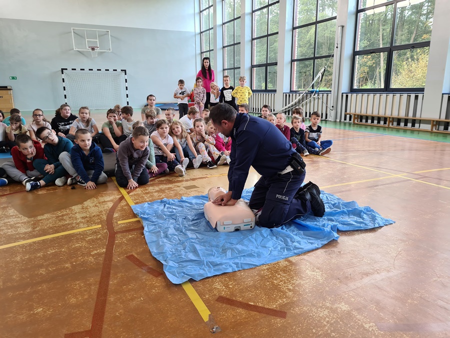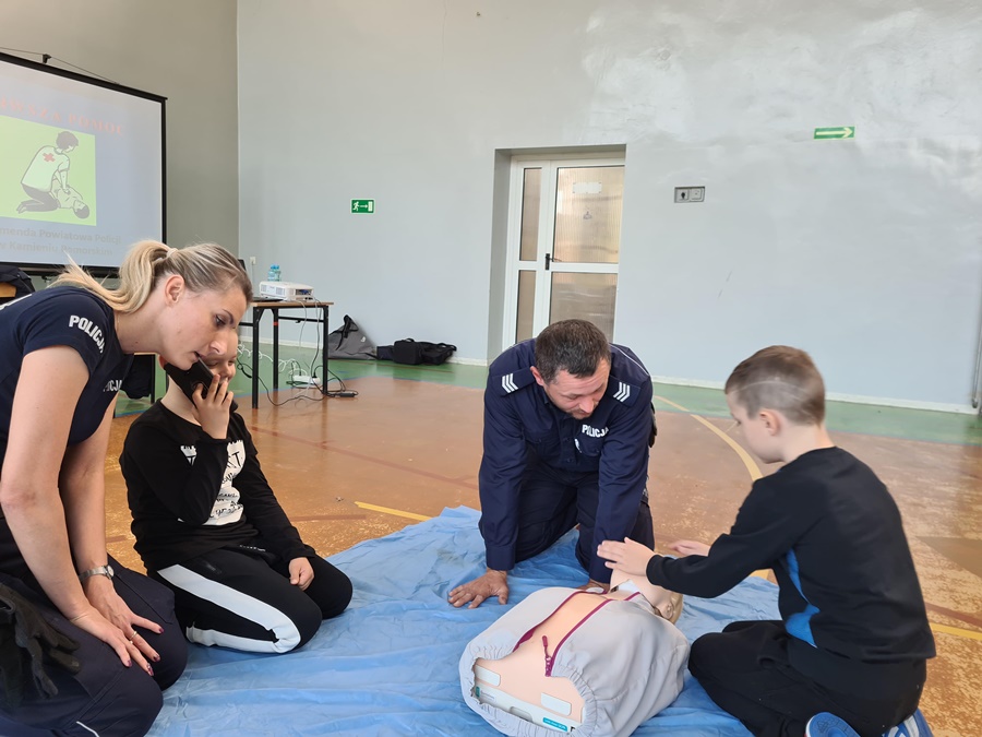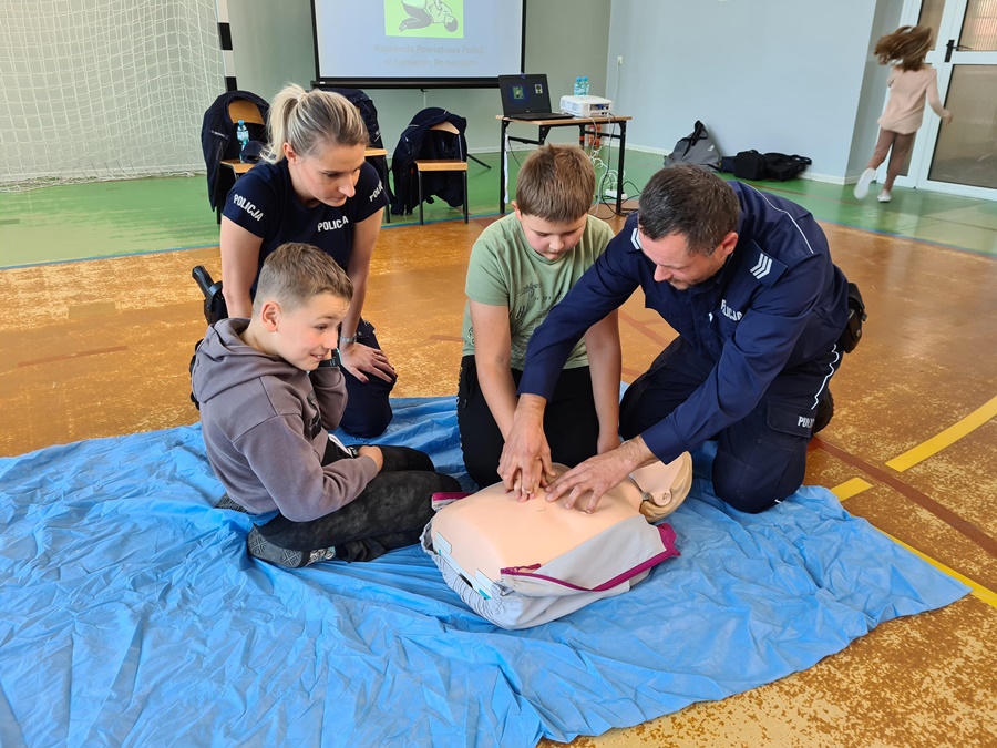 Celem wizyty było przypomnienie zasad udzielania pierwszej pomocy, ważnych telefonów, jak zachować się podczas wypadku, jak określić położenie na drodze, którą jedziemy, ułożenie osoby poszkodowanej w pozycji bezpiecznej. W pierwszej kolejności funkcjonariuszka zaprezentowała prezentację w sposób teoretyczny, następnie były zajęcia praktyczne. Uczniowie dowiedzieli się, że ważnym elementem podczas udzielania pomocy jest ocena miejsca zdarzenia pod kątem bezpieczeństwa i jeśli jest bezpiecznie można przystąpić do udzielania pomocy, dbając o własne bezpieczeństwo. Następnie ważna jest ocena przytomności, należy podejść do poszkodowanego, upewnić się - czy jest przytomny. Jeśli zareaguje - poszkodowany jest przytomny, brak reakcji oznacza, że poszkodowany jest nieprzytomny. Jeśli są świadkowie zdarzenia, osoby postronne, wyznaczamy osobę do pomocy. Prosimy o wezwanie pogotowia, upewniamy się czy pogotowie zostało wezwane. Jeśli jesteśmy sami, a poszkodowany jest osobą dorosłą przed rozpoczęciem resuscytacji krążeniowo - oddechowej musimy wezwać odpowiednie służby. W Polsce używamy numeru alarmowego 112 lub bezpośredniego 999. Wzywający musi poinformować o miejscu zdarzenia, liczbie poszkodowanych, ich stanie, co się stało i podać swój numer telefonu. Należy zachowywać się asertywnie i zdecydowanie, wydawać krótkie i zrozumiałe polecenia. Przed oceną oddechu należy udrożnić drogi oddechowe przez odgięcie głowy poszkodowanego do tyłu. Następnie stosujemy metodę ,,3P”: poczuj (zbliżamy ucho do ust i nosa poszkodowanego), posłuchaj, popatrz (ruch klatki piersiowej i brzucha). Ocenę prowadzimy przez 10 sekund. Jeśli usłyszeliśmy, zobaczyliśmy, poczuliśmy dwa lub więcej oddechów przyjmujemy, że poszkodowany oddycha. Jeśli oddechów było mniej przyjmujemy, że poszkodowany nie oddycha. Lekcja z pierwszej pomocy zostanie długo w pamięci naszych uczniów. Dziękujemy policjantom za spotkanie, przekazanie ważnych oraz cennych informacji i poświęcenie swojego czasu.