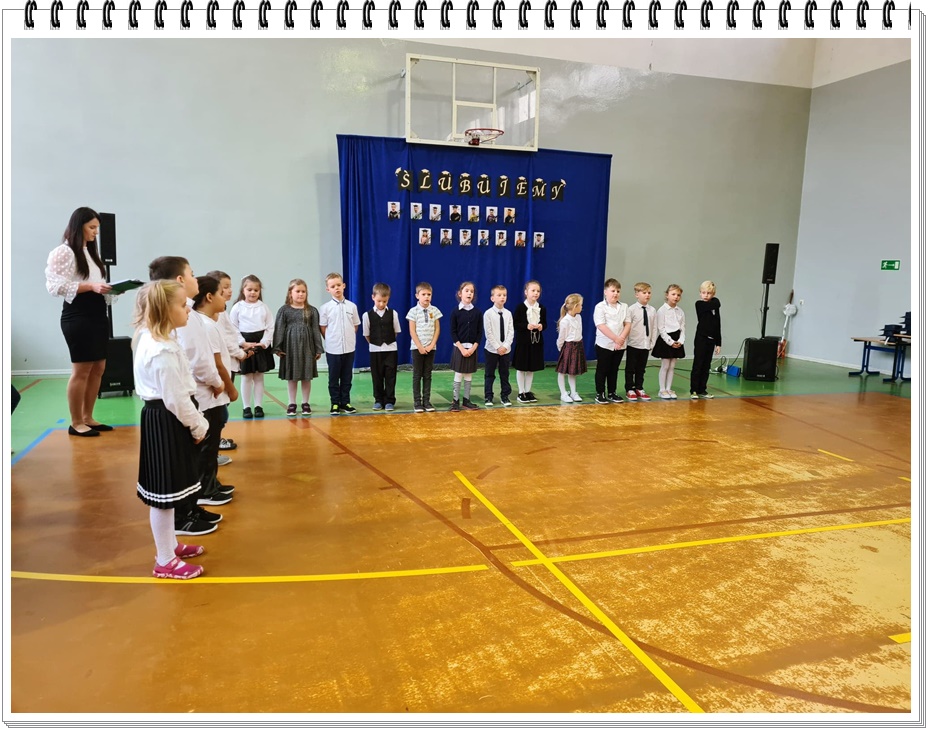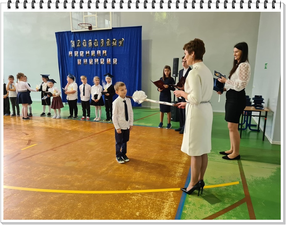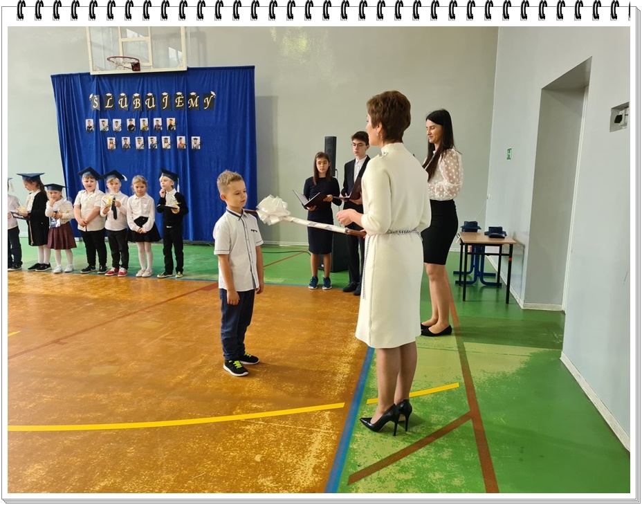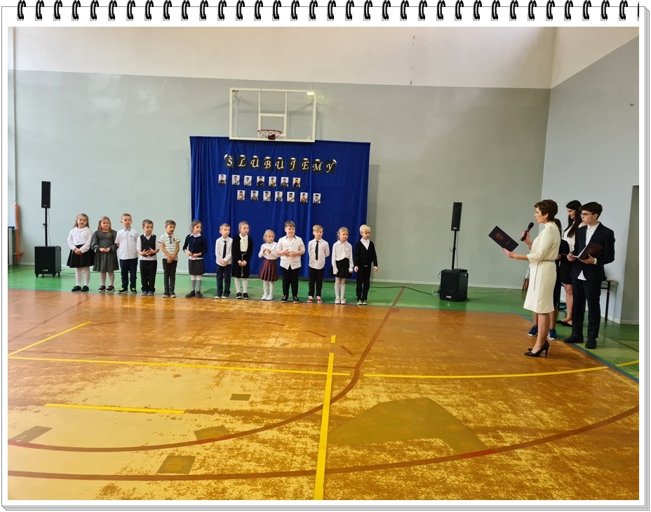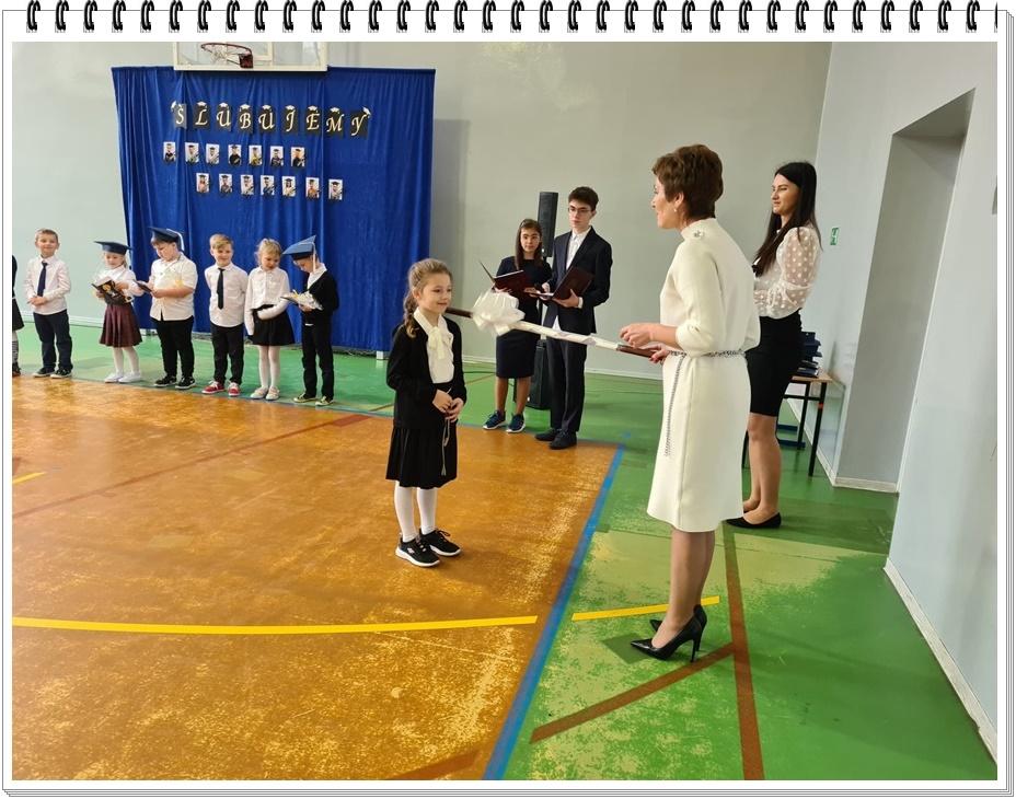 Najpierw jednak uczniowie zaprezentowali przygotowany przez siebie program artystyczny. Pochwalili się swoimi talentami: recytowali wiersze i śpiewali piosenki. Wykazali się wiedzą, jaką już zdobyli w szkole. Po nim ślubowali sumiennie wywiązywać się z uczniowskich obowiązków i przynosić szkole dumę. Po ślubowaniu pani dyrektor Beata Pastryk dokonała aktu pasowania.
