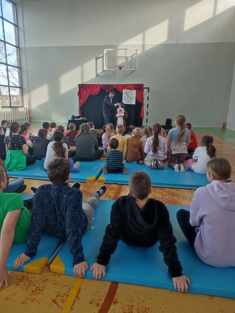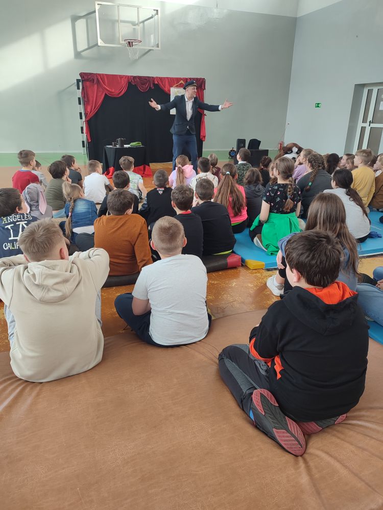 W piątek 23 lutego 2024r. nasza szkoła gościła aktorów Teatru Młodego Pokolenia. Aktorzy zaprezentowali uczniom klas 0-VII spektakl pt. "O psie, który jeździł koleją". Aktorzy swoim występem przybliżyli dzieciom losy głównego bogatera książki Ramana Pisarskiego, zachęcając ich jednocześnie do przeczytania lektury.