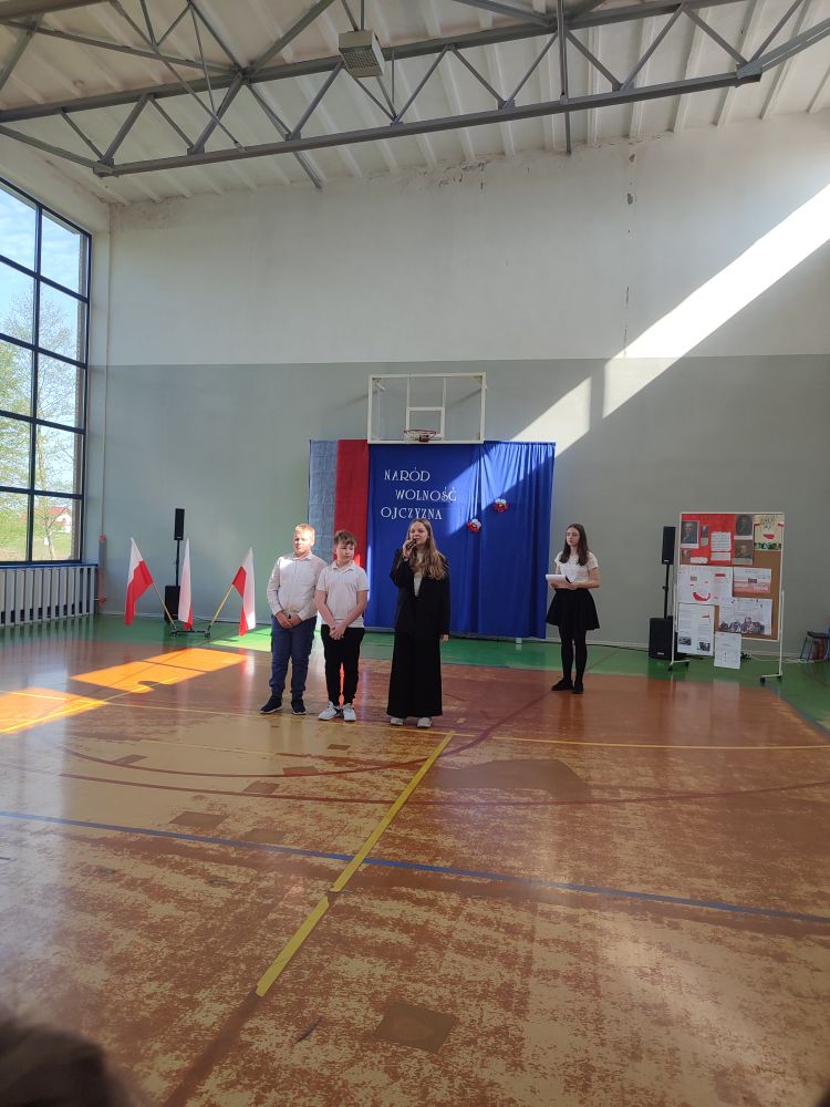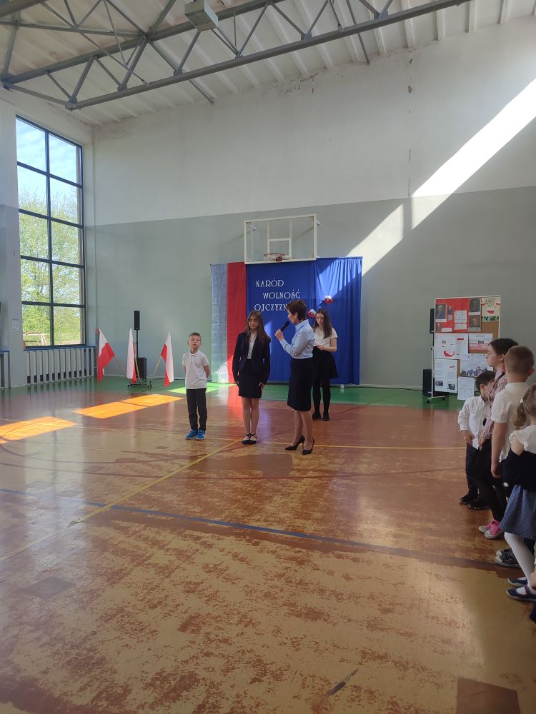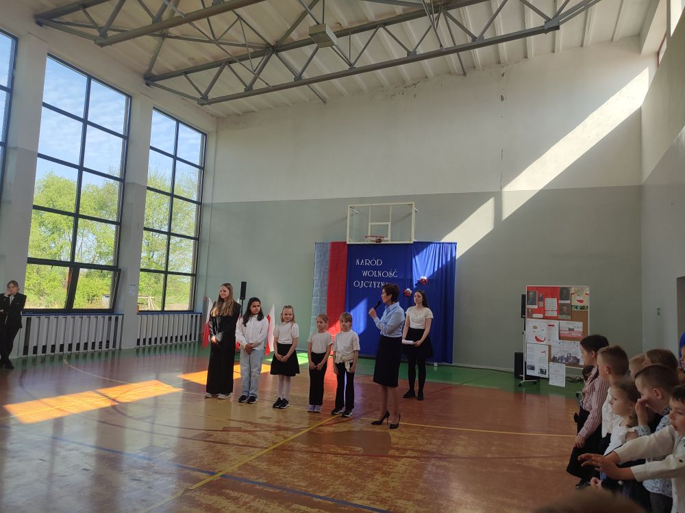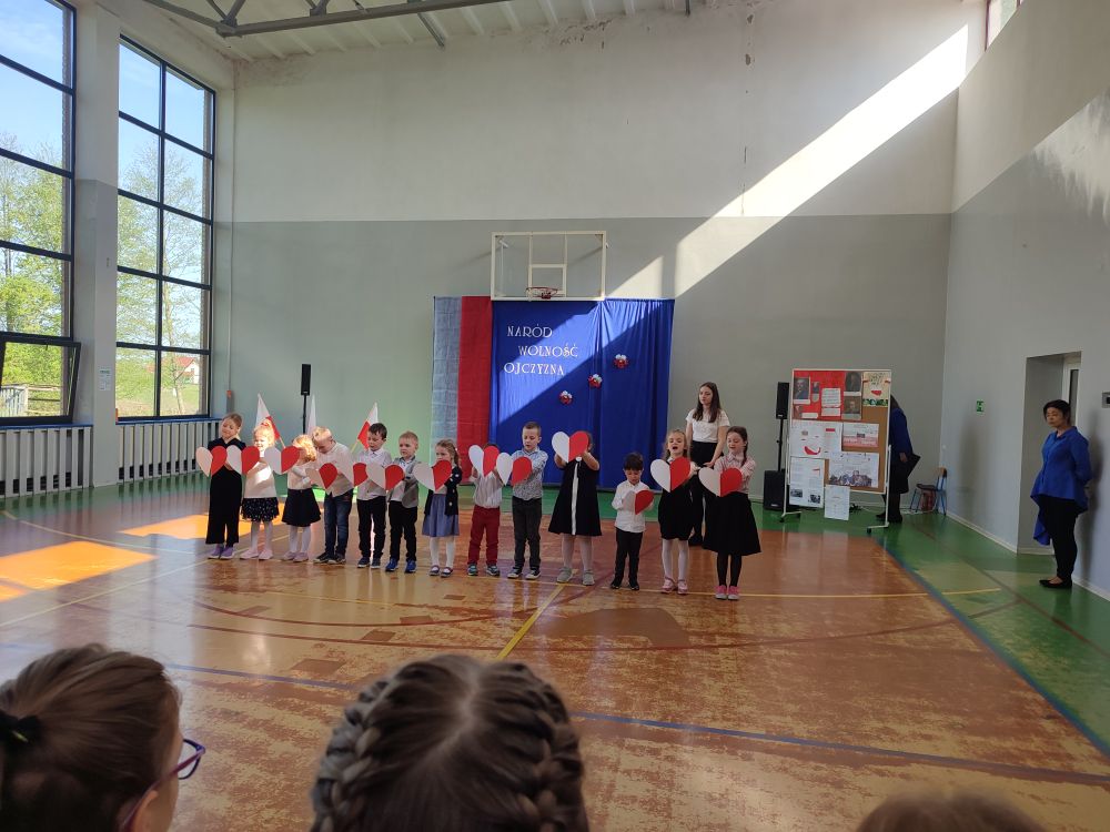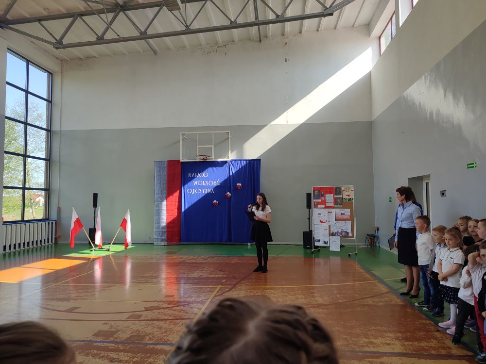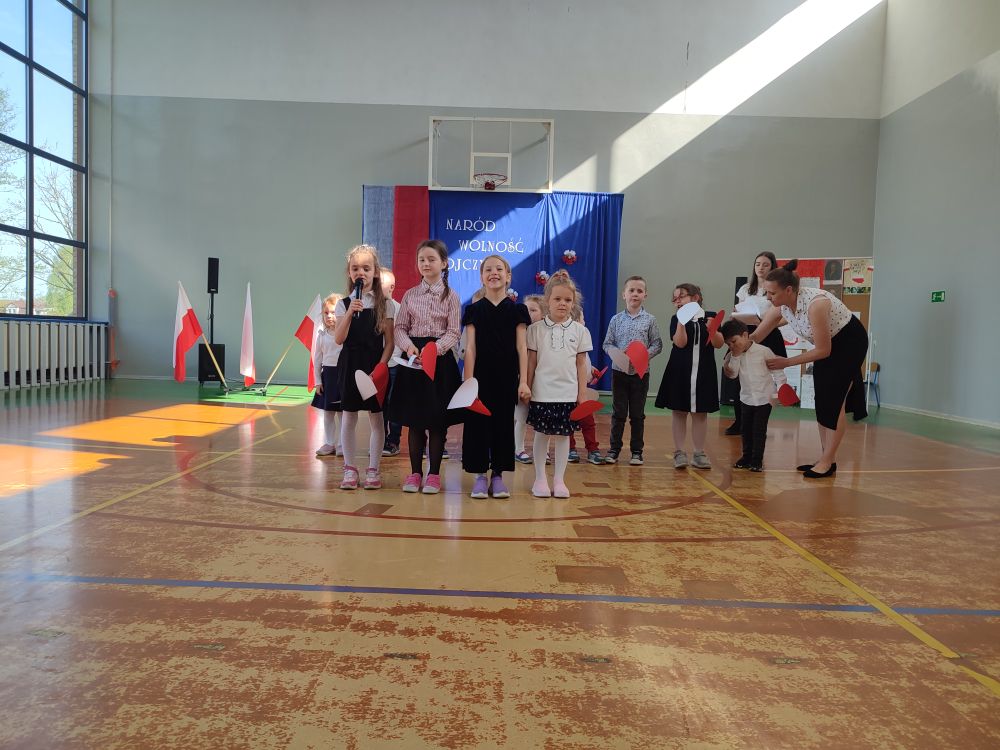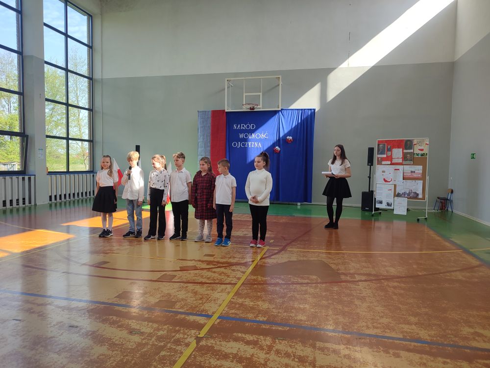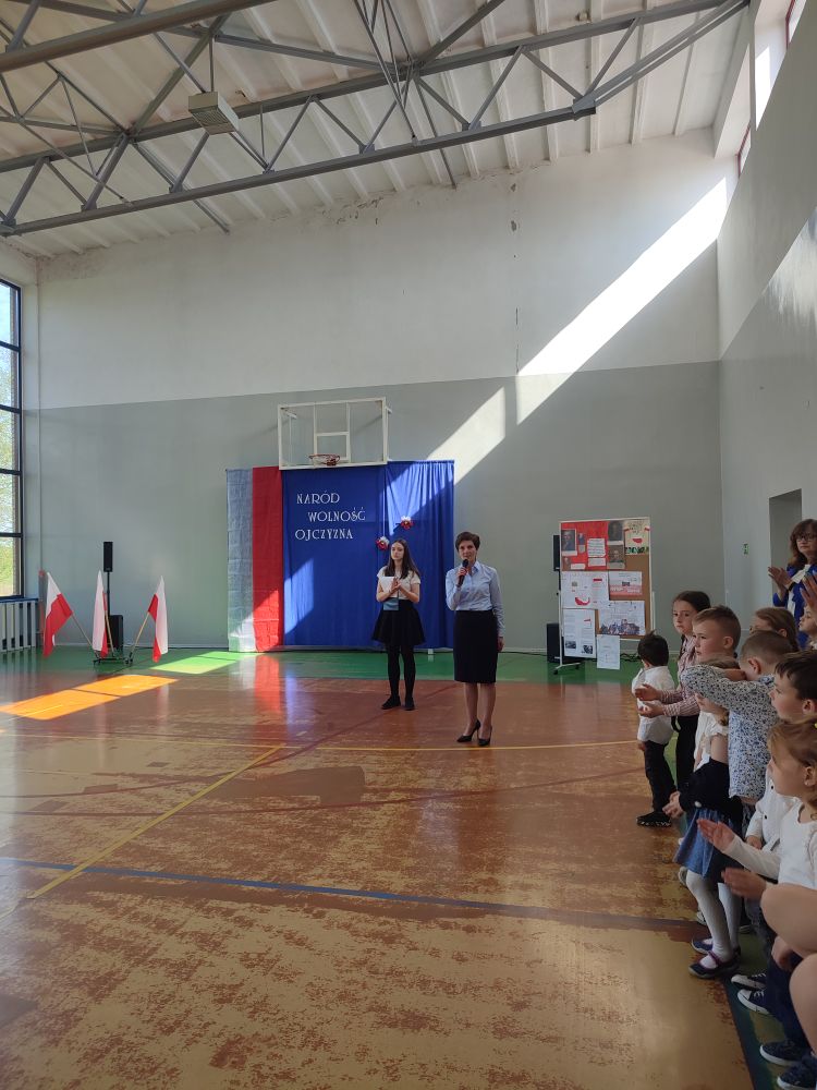 O tych ważnych wydarzeniach pamiętają przedszkolaki i uczniowie naszej szkoły. 30 kwietnia 2024 r. odświętnie ubrani zgromadzili się wraz z nauczycielami i rodzicami w sali gimnastycznej, by wziąć udział w uroczystym apelu z okazji wspomnianych wyżej Rocznic Majowych. Wszystkich zgromadzonych powitała i zaprosiła na szkolną uroczystość uczennica klasy ósmej, Przewodnicząca Samorządu Uczniowskiego Zuzanna Kaczmarek. Obchody rozpoczęły się wspólnym odśpiewaniem pełnej wersji hymnu narodowego i złożeniem klasowego raportu pani Dyrektor Beacie Pastryk. Następnie przedszkolaki zaprezentowały piosenkę i wiersz patriotyczny. W części artystycznej wzięli udział uczniowie wszystkich klas recytując przede wszystkim patriotyczne wiersze oraz przedstawiając krótki rys historyczny przybliżający tradycje związane z majowymi świętami. Młodzi wykonawcy podeszli do występów z dużym zaangażowaniem, czym pięknie podkreślili swój szacunek i pamięć o tych wszystkich, którzy swym wysiłkiem i poświęceniem przyczynili się do niepodległości, wolności i rozkwitu naszej Ojczyzny. Tegoroczne obchody przebiegały pod hasłem: Naród, Wolność, Ojczyzna widocznym na świątecznych dekoracjach. Ich elementem były poza tym m. in. plakaty historyczne przygotowane przez uczniów klasy siódmej i ósmej.