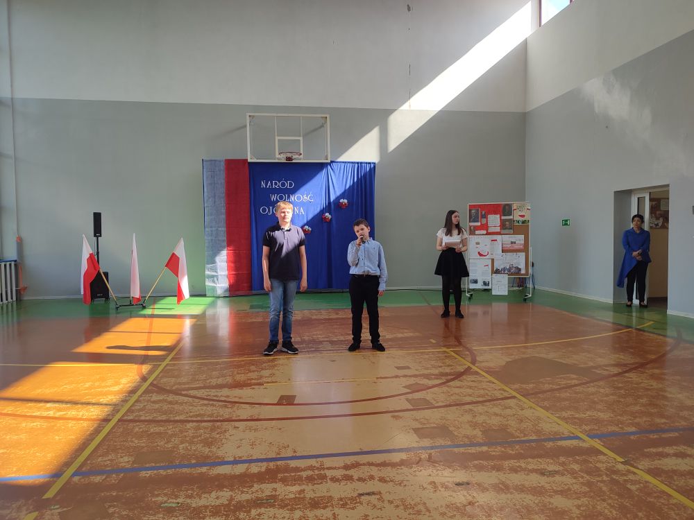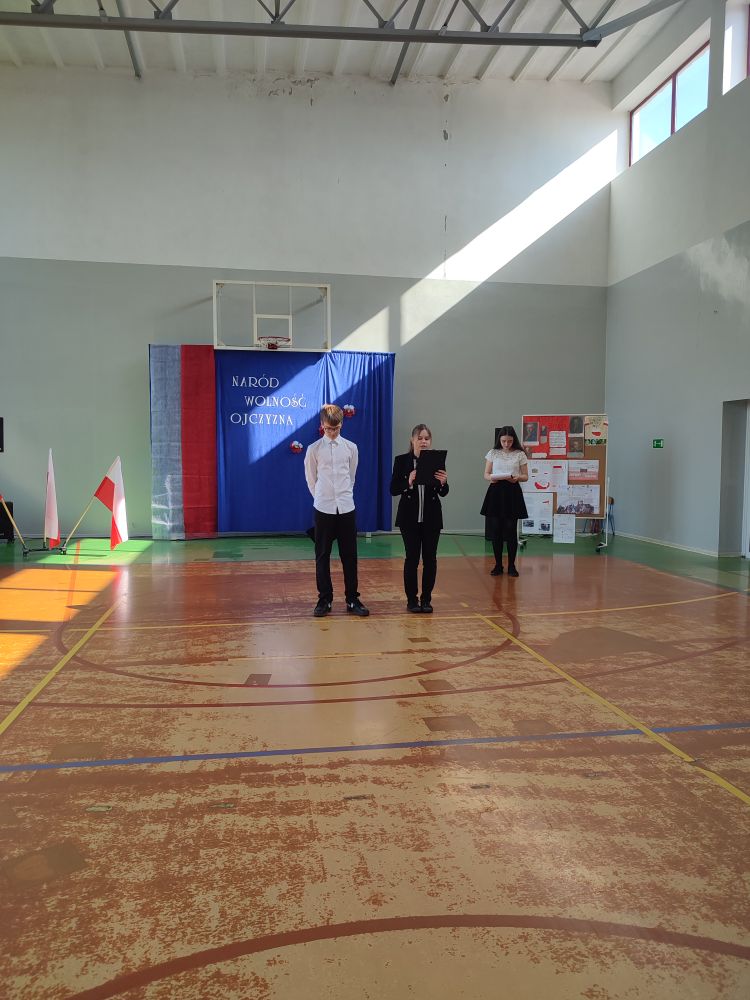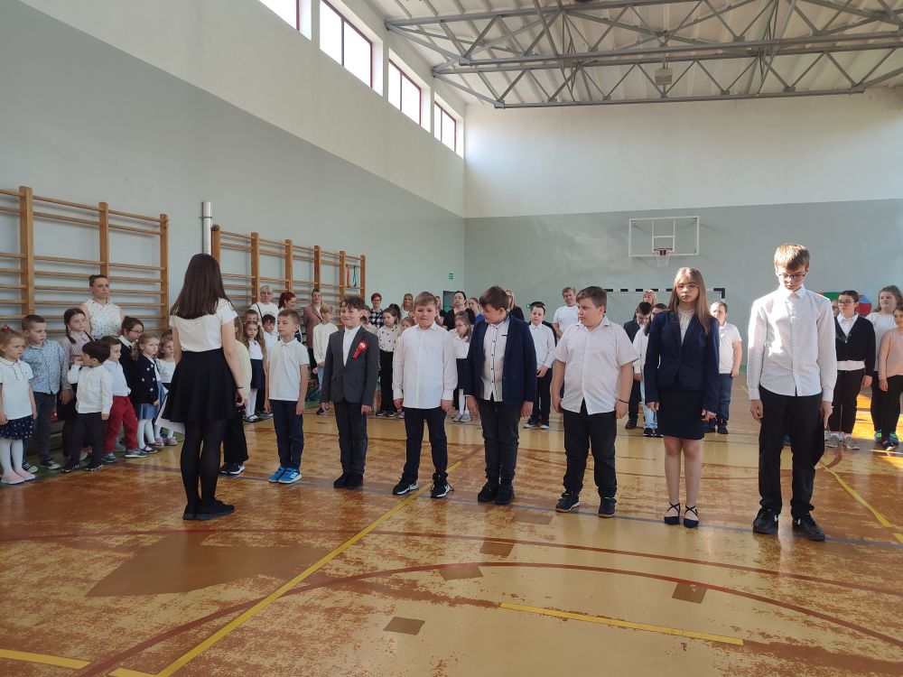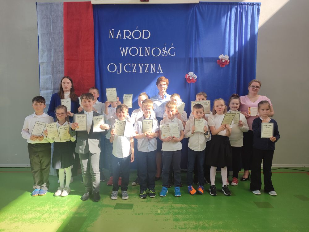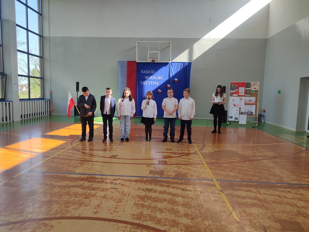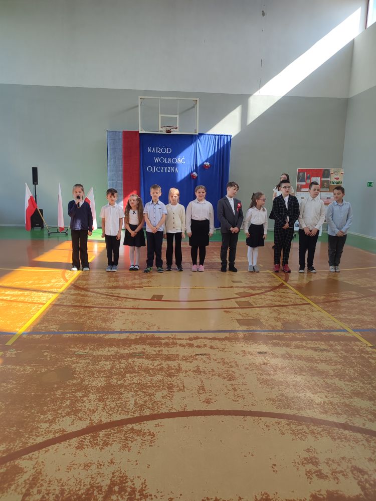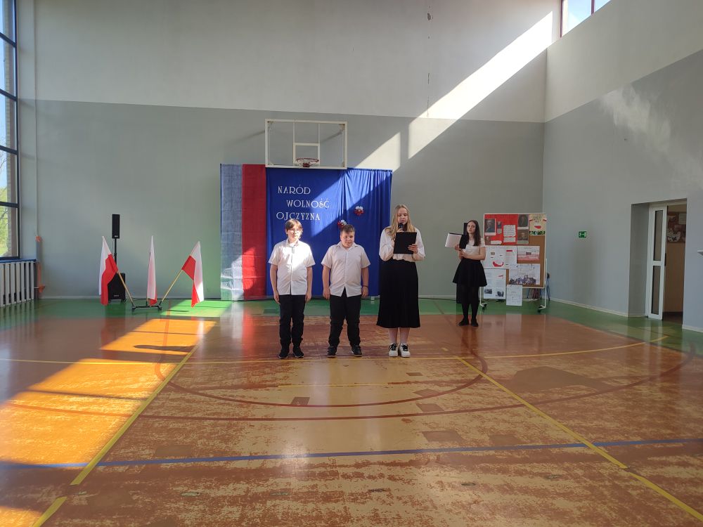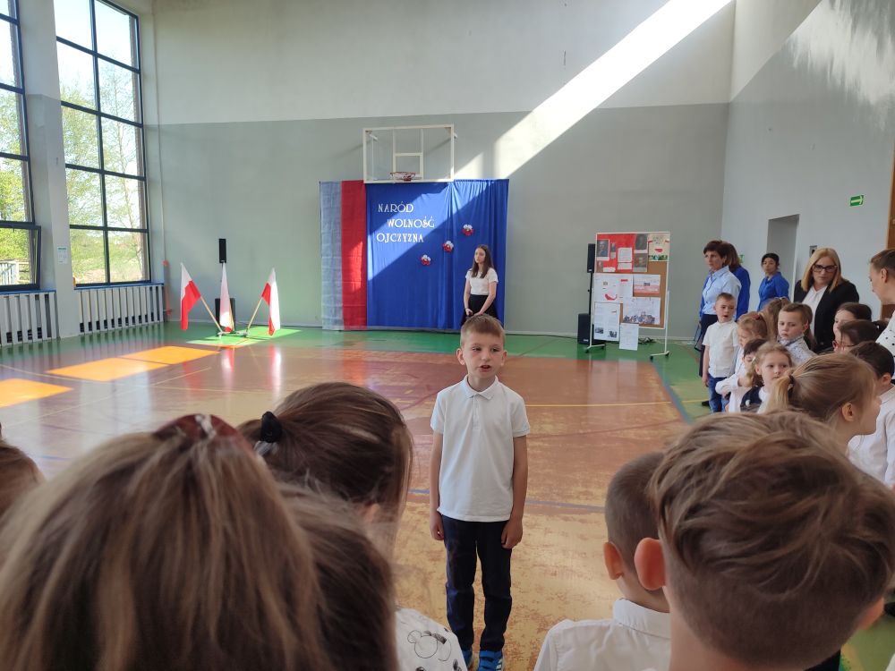 O tych ważnych wydarzeniach pamiętają przedszkolaki i uczniowie naszej szkoły. 30 kwietnia 2024 r. odświętnie ubrani zgromadzili się wraz z nauczycielami i rodzicami w sali gimnastycznej, by wziąć udział w uroczystym apelu z okazji wspomnianych wyżej Rocznic Majowych. Wszystkich zgromadzonych powitała i zaprosiła na szkolną uroczystość uczennica klasy ósmej, Przewodnicząca Samorządu Uczniowskiego Zuzanna Kaczmarek. Obchody rozpoczęły się wspólnym odśpiewaniem pełnej wersji hymnu narodowego i złożeniem klasowego raportu pani Dyrektor Beacie Pastryk. Następnie przedszkolaki zaprezentowały piosenkę i wiersz patriotyczny. W części artystycznej wzięli udział uczniowie wszystkich klas recytując przede wszystkim patriotyczne wiersze oraz przedstawiając krótki rys historyczny przybliżający tradycje związane z majowymi świętami. Młodzi wykonawcy podeszli do występów z dużym zaangażowaniem, czym pięknie podkreślili swój szacunek i pamięć o tych wszystkich, którzy swym wysiłkiem i poświęceniem przyczynili się do niepodległości, wolności i rozkwitu naszej Ojczyzny. Tegoroczne obchody przebiegały pod hasłem: Naród, Wolność, Ojczyzna widocznym na świątecznych dekoracjach. Ich elementem były poza tym m. in. plakaty historyczne przygotowane przez uczniów klasy siódmej i ósmej.