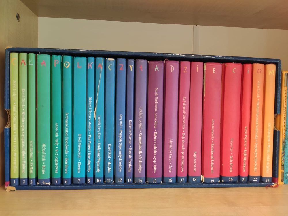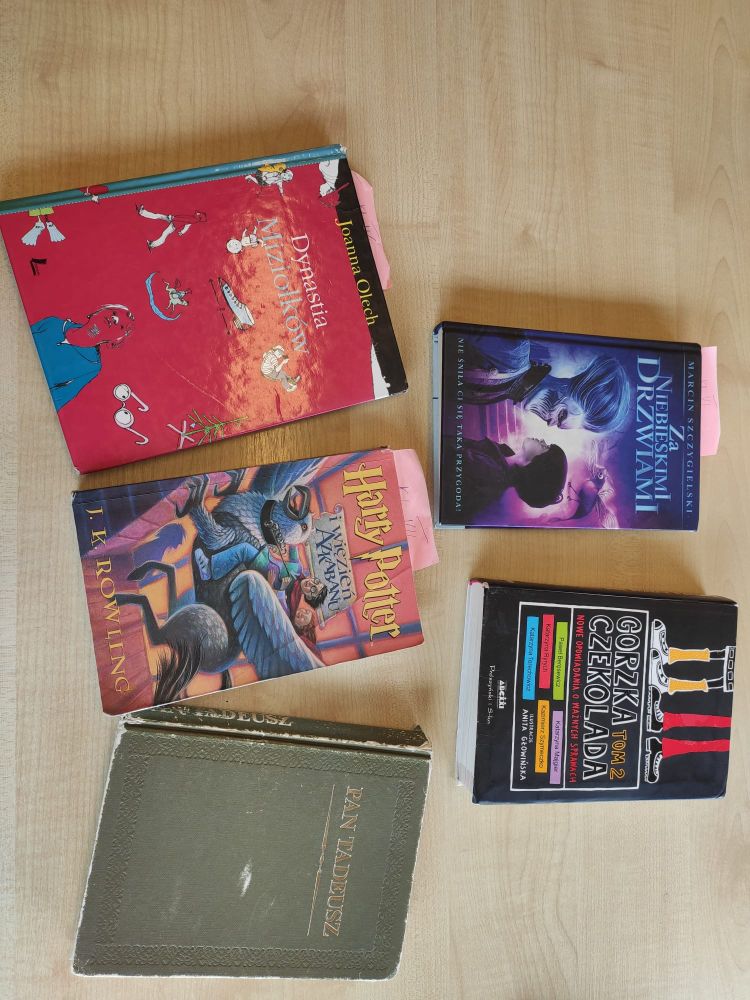 Uczniowie klas 4-8 z zainteresowaniem słuchali głośnego czytania następujących pozycji książkowych: Krystyna Drzewiecka "Piątka z Zakątka", Joanna Olech "Dynastia Miziołków", Andrzej Maleszka "Magiczne drzewo. Czas robotów", J. K Rowling "Harry Potter. Kamień filozoficzny", "Więzień Azkabanu", W. Bruce Cameron "O psie, który dał słowo", Joanna Pawłowska "Pan Tadeusz w XXI wieku", Marcin Szczygielski "Za niebieskimi drzwiami", "Gorzka czekolada. Nowe opowiadania o ważnych sprawach".