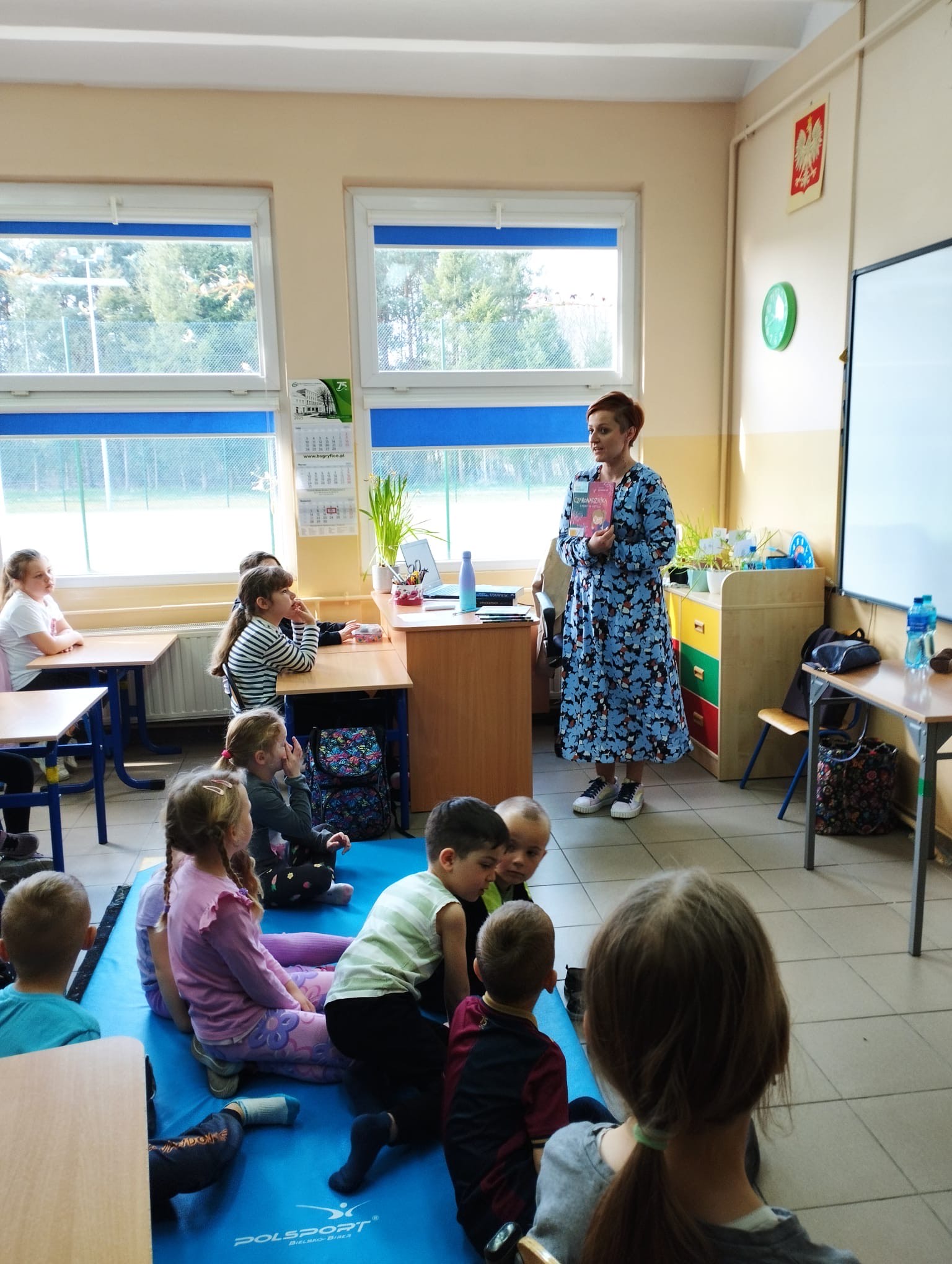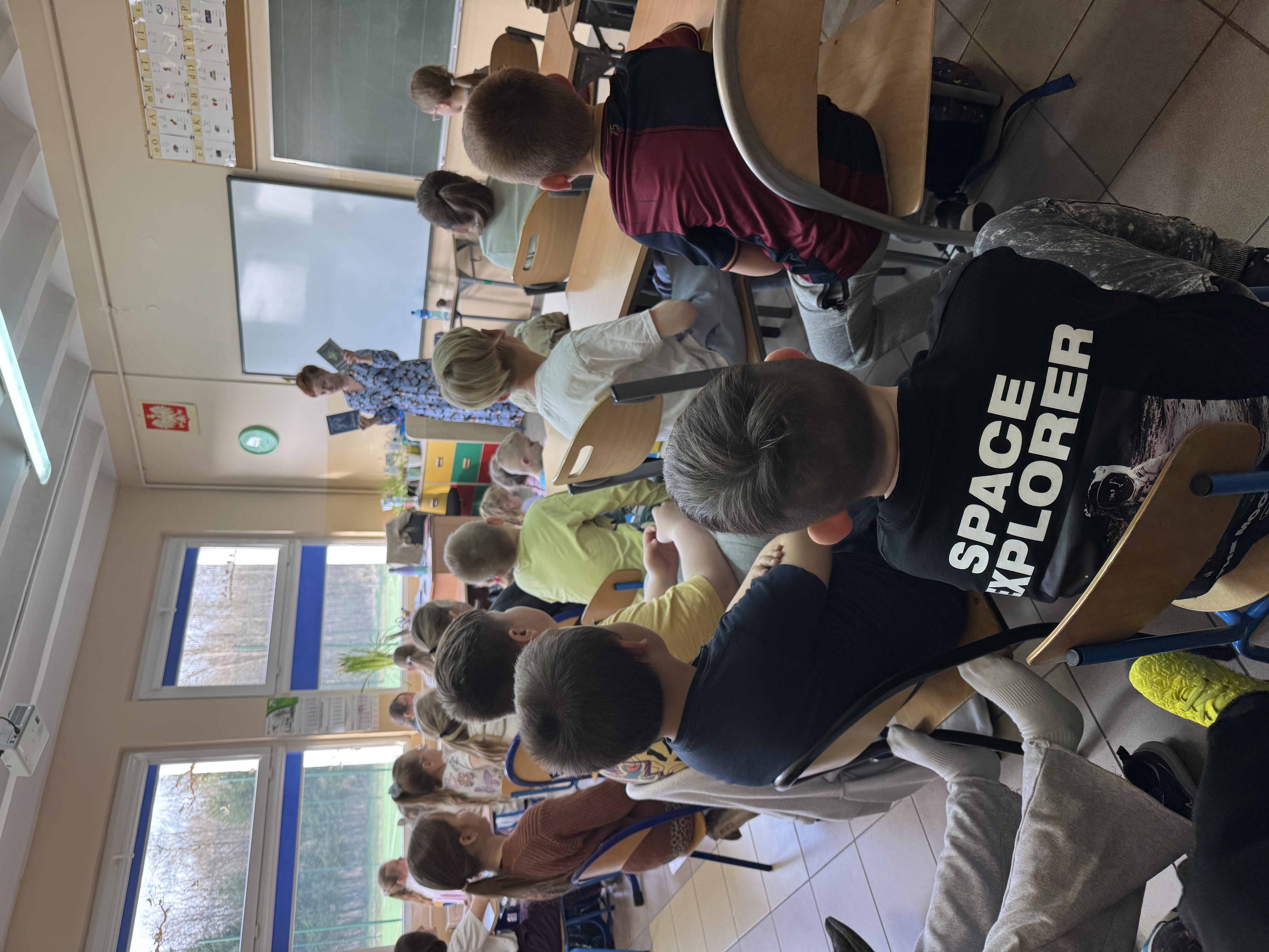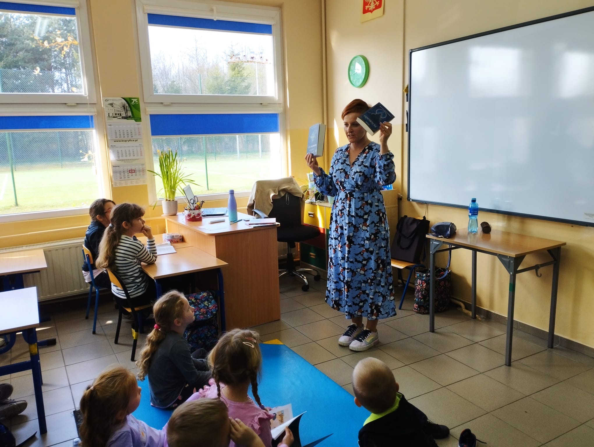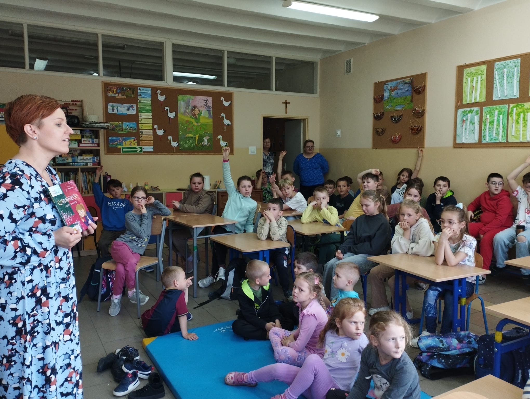 14 kwietnia 2025 roku po raz drugi mogliśmy uczestniczyć w spotkaniu z bliską nam pisarką. Pani Agata Cieszyńska , która znalazła czas, by nas odwiedzić, była uczennicą naszej szkoły i po latach kolejny raz powraca do swojej szkoły podstawowej, gdzie w zajmujący sposób wprowadza młodych czytelników w niezwykły świat literatury. Po serdecznym powitaniu przez panią Dyrektor Beatę Pastryk na początku spotkania, młodszym i starszym uczniom pani Agata z wdziękiem i cierpliwością opowiadała o swoich najnowszych książkach: ,,O początkach” i ,,Czaronadziejka i pobyt w hotelu”. Pierwsza z książek to drugi tom sagi „Opowieść”, którą starsi uczniowie mogli poznać w ubiegłym roku szkolnym. Zadawali liczne pytania dotyczące właśnie wydanego tomu oraz próbowali dowiedzieć się czegoś o przyszłych losach aureusów walczących o odrodzenie dobra.