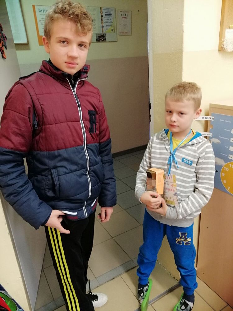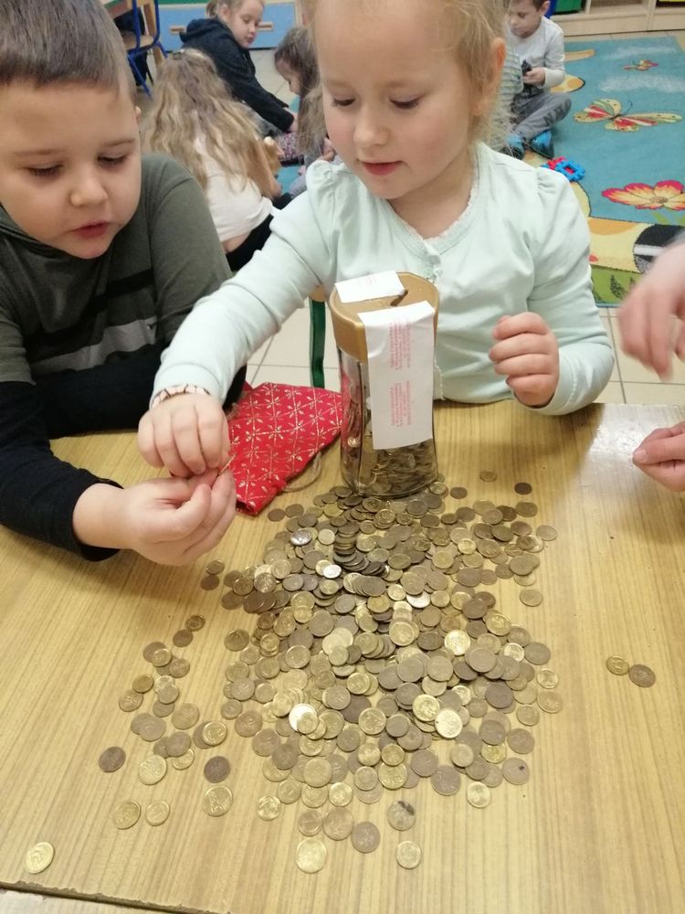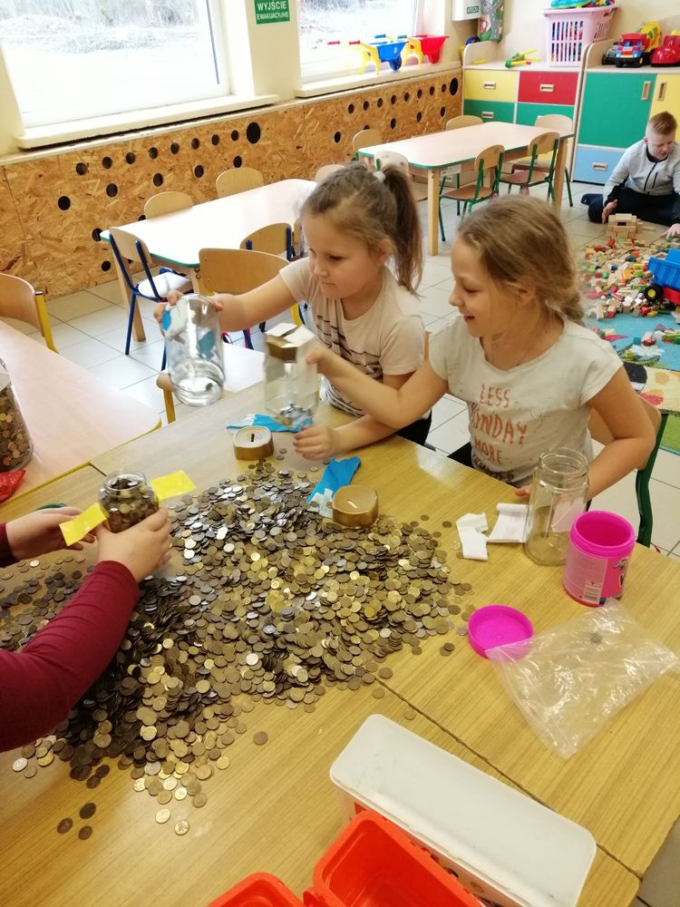 Po zakończeniu akcji dzieci z klasy 0 oraz uczniowie starszych klas posegregowali zgromadzone monety. Do liczenia z ogromnym zaangażowaniem w ramach zajęć świetlicowych przyłączyli się uczniowie klasy VII i VIII.