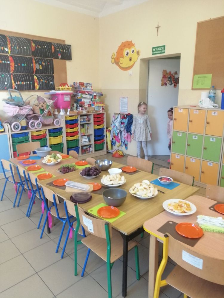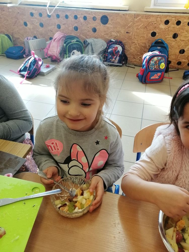 Dzień 13 marca w naszym przedszkolu rozpoczął się wyjątkowo. Chłopcy z klasy 0 z pomocą Pani Beaty Kaczmarek i Pani Oli postanowili przygotować dla swoich koleżanek smaczną i zdrową niespodziankę. W całej sali unosił się zapach świeżych owoców, z których własnoręcznie przygotowywaliśmy pyszną witaminową sałatę. Stoły obfitowały w pyszności. Były jabłka, gruszki, banany, brzoskwinie, nektarynki, kiwi, pomarańcze, mandarynki, winogrona, a nawet ananas, mango oraz granat.