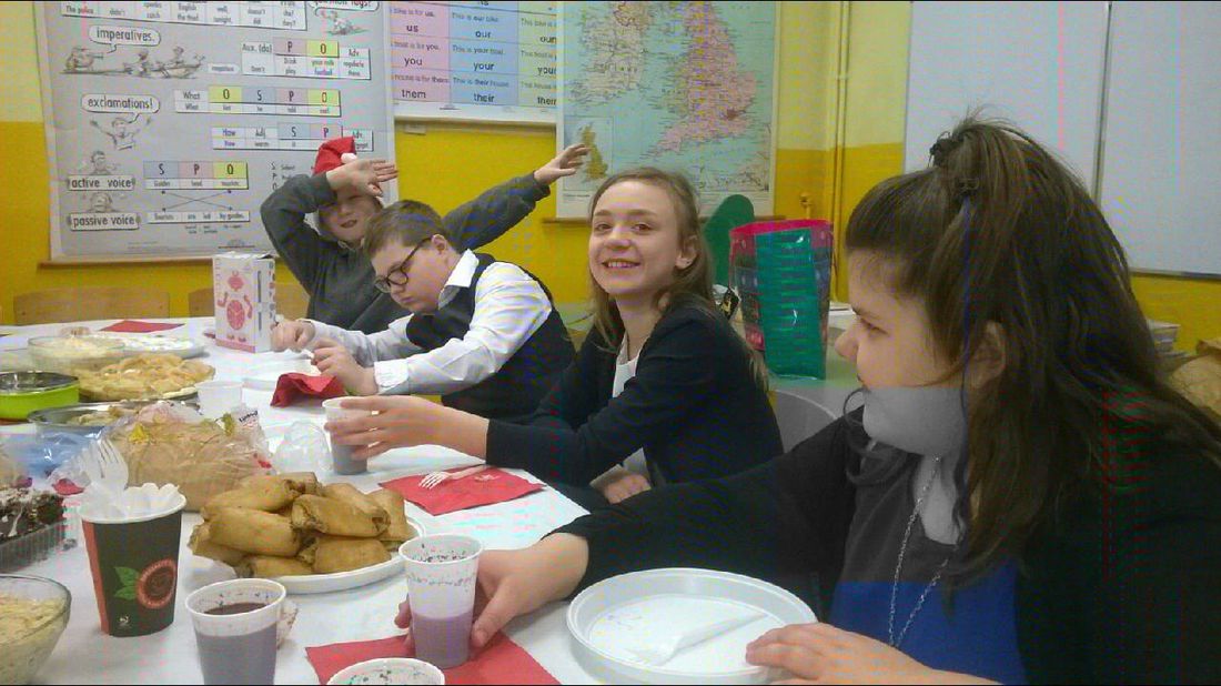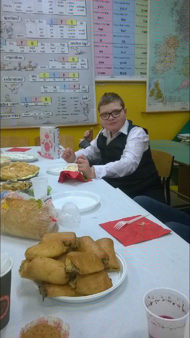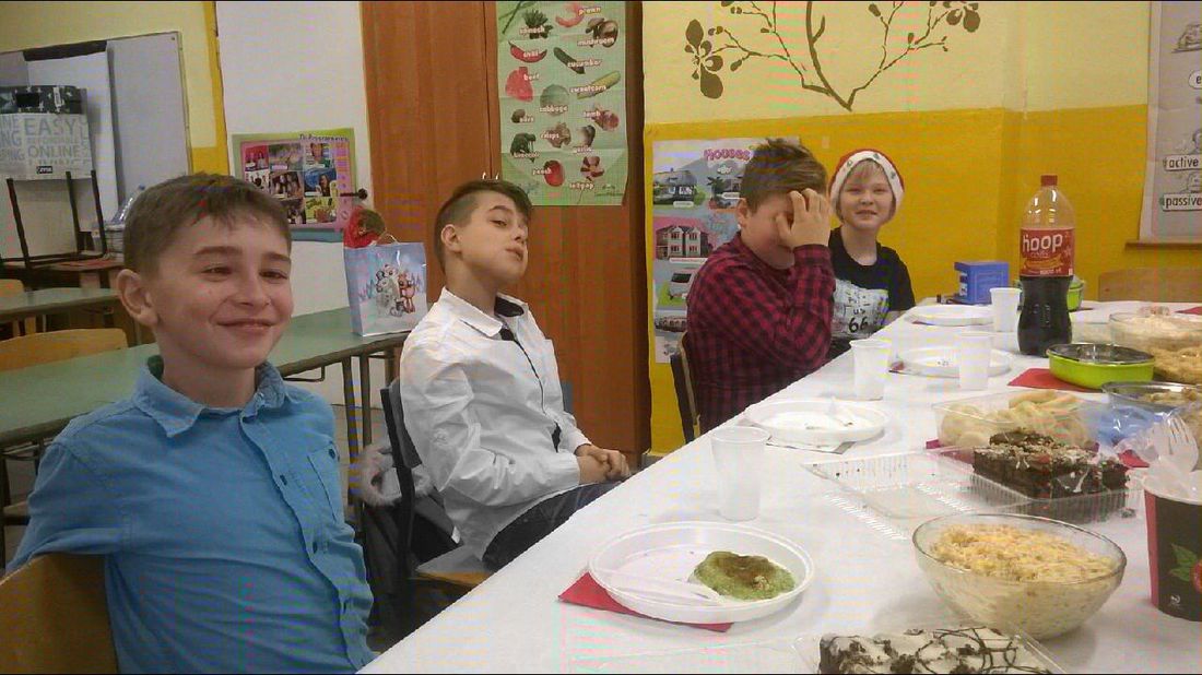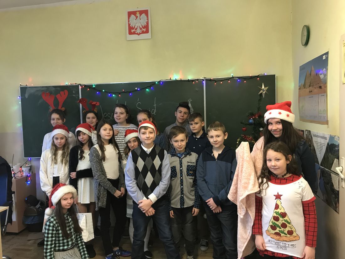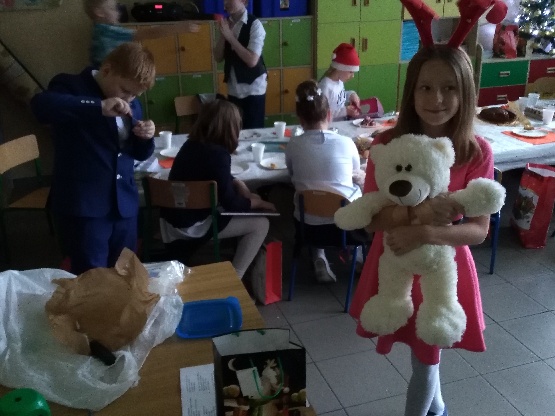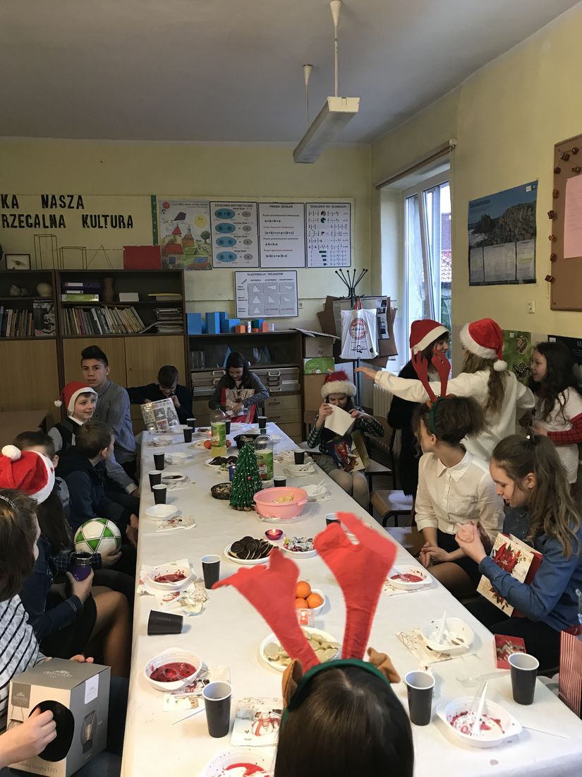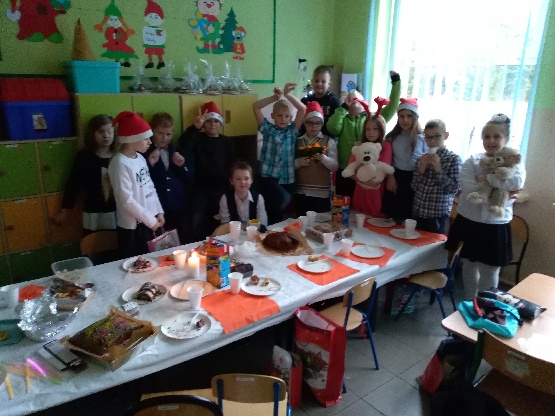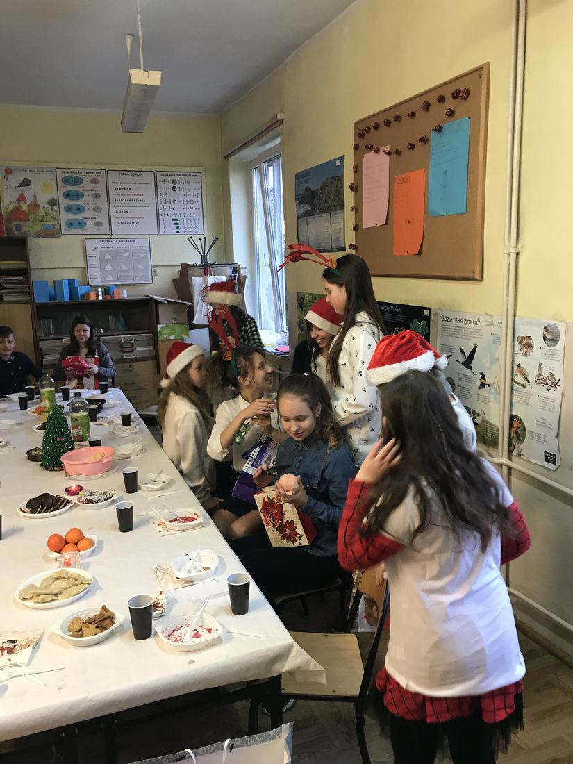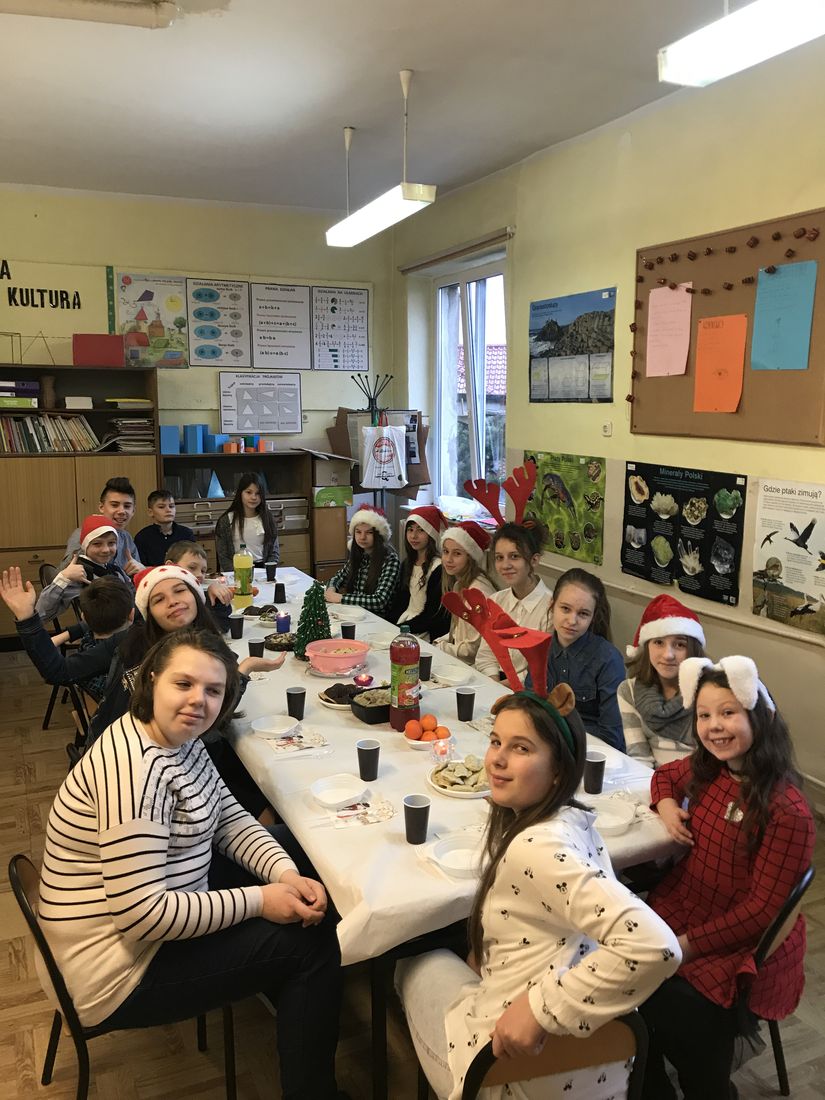 W klasach starszych pojawiły się wigilijne stoły nakryte śnieżnobiałymi obrusami. Opłatek, życzenia, gwiazdkowe prezenty, wspólne śpiewanie kolęd oraz poczęstunek stworzyły świąteczno – noworoczne klimaty. Nie zabrakło również miłej, rodzinnej atmosfery.