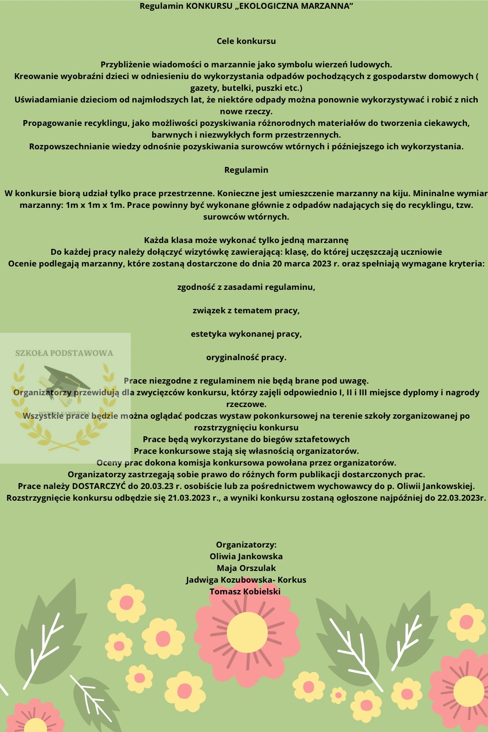Zapraszamy do udziału w szkolnym konkursie na wykonanie "Ekologicznej marzanny". Szczegóły oraz regulamin konkursu znajdują się w zalączniku: Regulamin konkursu