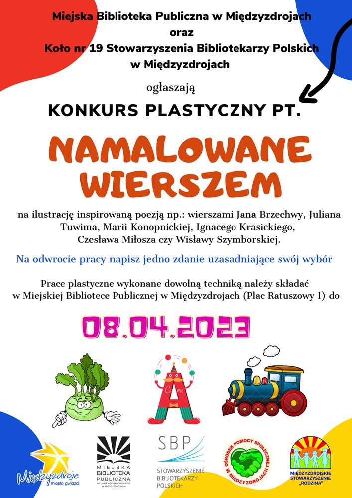 Miejska Biblioteka Publiczna w Międzyzdrojach, Stowarzyszenie Bibliotekarzy Polskich koło nr 19 oraz Ośrodek Pomocy Społecznej w Międzyzdrojach zapraszają do wzięcia udziału w konkursie plastycznym pt. „Namalowane wierszem”. Konkurs skierowany jest do dzieci z oddziału przedszkolnego oraz do uczniów szkół podstawowych i ponadpodstawowych.