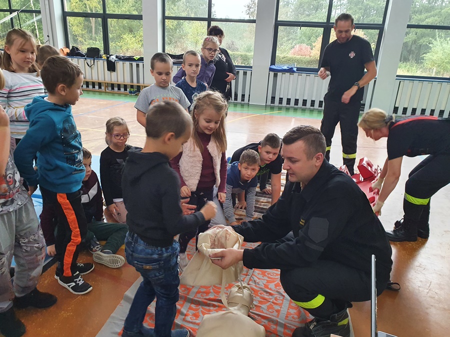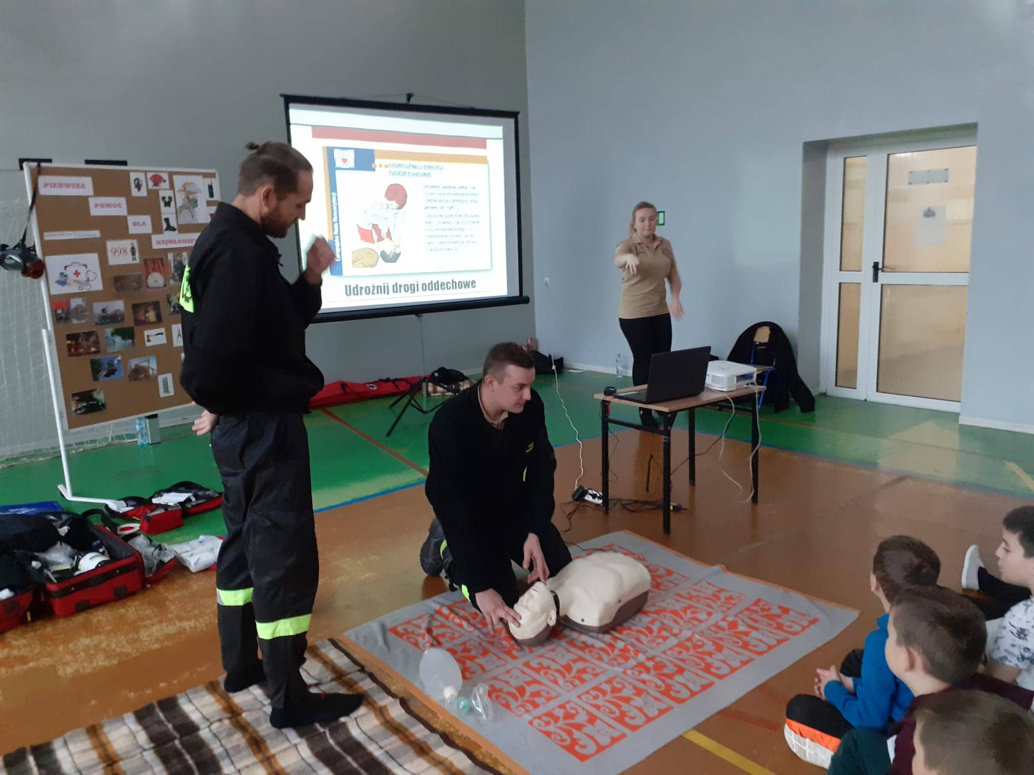 Również nauczyciele musieli wykazać się umiejętnością ratowania życia. Profesjonalizm, duże zaangażowanie strażaków oraz wiedza na temat udzielania pierwszej pomocy i specjalistyczny sprzęt - dały możliwość dzieciom poznać specyfikę pracy ratownika. Podczas spotkania strażacy przypomnieli uczniom o numerach alarmowych do straży pożarnej, policji oraz pogotowia. Dzieci wykazały się wiedzą, jak prawidłowo powinno przebiegać zgłoszenie o niebezpieczeństwie oraz jakie informacje powinny w nim się znaleźć. Strażacy zapoznali uczniów jak zachować się podczas zagrożenia zdrowia lub życia oraz jak należy postępować z osobą, która utraciła przytomność i jakie służby należy poinformować. Największym zaskoczeniem dla dzieci było to, że każdy uczeń miał możliwość przećwiczenia na manekinach sztucznego oddychania i masażu serca. Od dziś wiedzą jak ważne są pierwsze minuty dla osoby poszkodowanej. Następnie strażacy przekazali uczniom podstawową wiedzę na temat zachowania się w różnych sytuacjach niebezpiecznych, np. podczas powstania pożaru. Zaprezentowali również sprzęt ratowniczy znajdujący się na wyposażeniu samochodu straży pożarnej. Dzieci miały okazję go zobaczyć i dotknąć oraz dowiedzieć się do czego służy. Na zakończenie spotkania dzieci wręczyły dyplom - podziękowania oraz zostali obdarowani odblaskowymi wozami strażackimi.