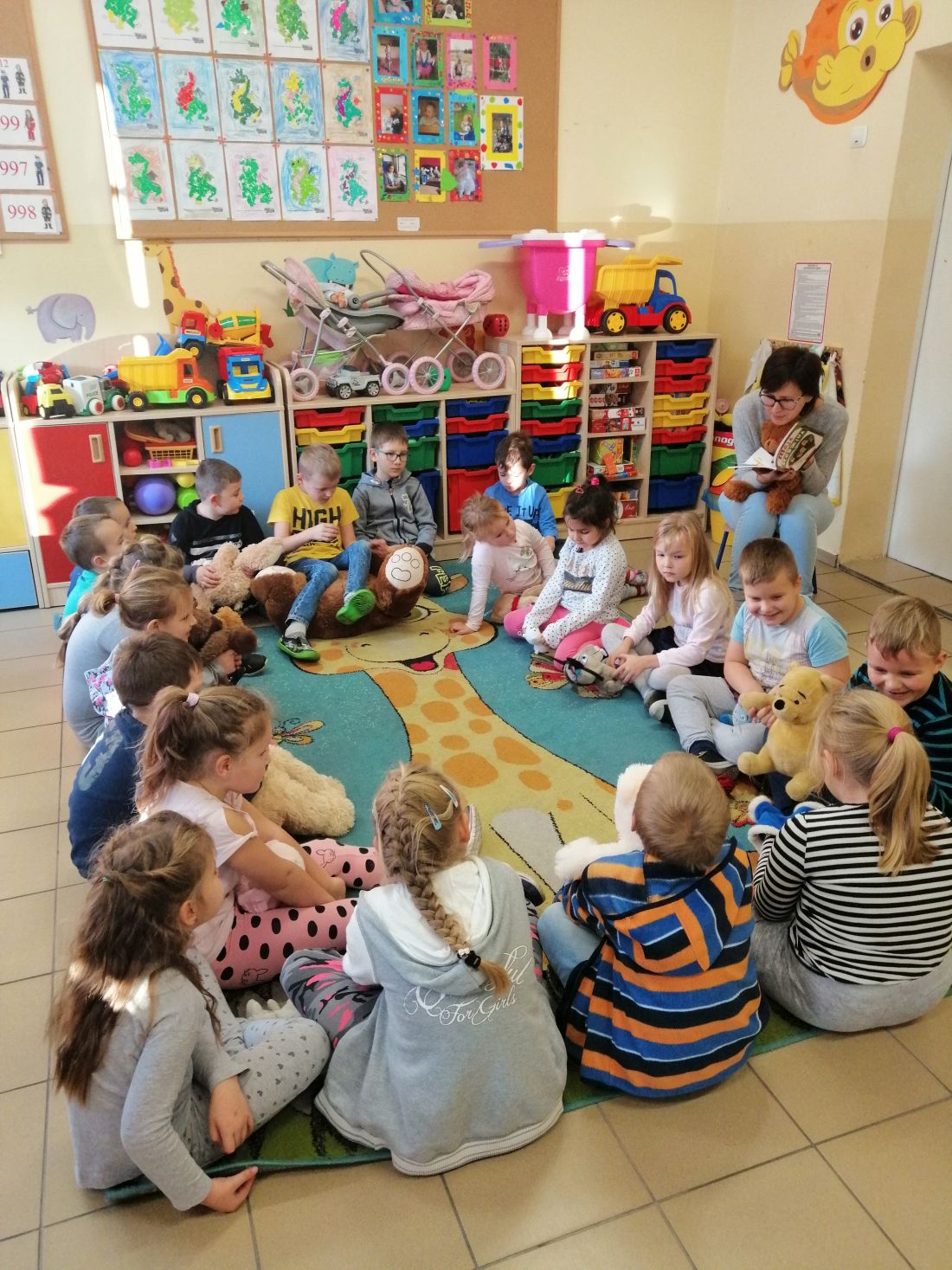 Na początku obchodów Pani powitała dzieci wspólną zabawą przy muzyce, następnie przybliżyła historię pluszowego misia oraz jego święta. Do obchodów przyłączyła się również Pani Danusia, nasza księgowa, która przeczytała dzieciom bajki o misiowych bohaterach.