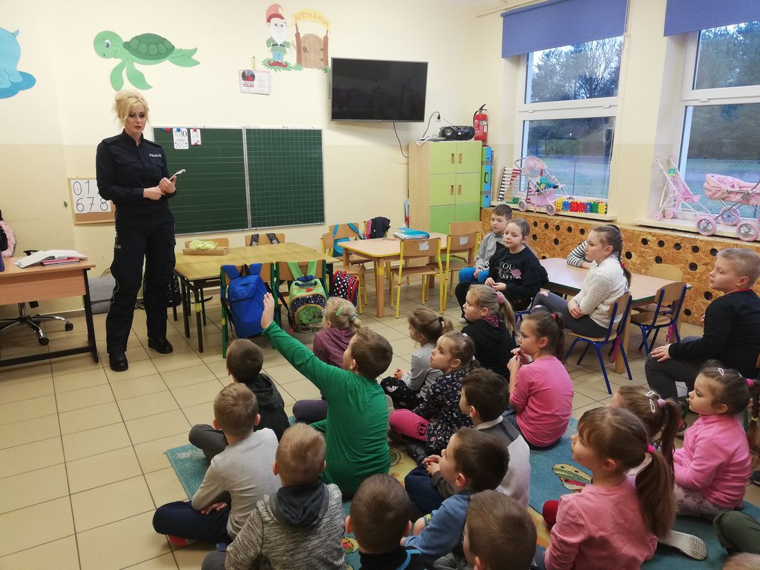 „Bezpieczne ferie” - to temat spotkania pani policjantki z Komendy Powiatowej Policji w Kamieniu Pomorskim z uczniami naszej szkoły. W związku ze zbliżającymi się feriami zimowymi we wtorek, 29 stycznia 2020 r. naszą szkołę odwiedził funkcjonariuszka służby prewencji, która przeprowadziła pogadankę na temat bezpieczeństwa podczas zimowej przerwy. Pani policjantka przypomniała o podstawowych zasadach bezpieczeństwa, apelowała o rozwagę w trakcie zabaw na śniegu i lodzie. Uczniowie usłyszeli przestrogi mające na celu uświadomienie zagrożeń wynikających z zabaw w miejscach niedozwolonych. Przestrzegała przed zabawami w miejscach niedozwolonych, gdzie może dojść do wypadku, o przykrych skutkach wchodzenia na kruchy lód, zjeżdżania na sankach w pobliżu jezdni, zbliżania się do nieznajomych osób. Omówiła także zasady zachowania się w domu podczas, gdy rodzice są w pracy oraz ostrzegła przed kontaktami z nieznajomymi. Na zakończenie przypomniała, jak ważne jest noszenie elementów odblaskowych. Każdy uczeń otrzymał opaski oraz breloki odblaskowe a kończąc spotkanie życzyła dzieciom  oraz nauczycielom przyjemnego i bezpiecznego wypoczynku.